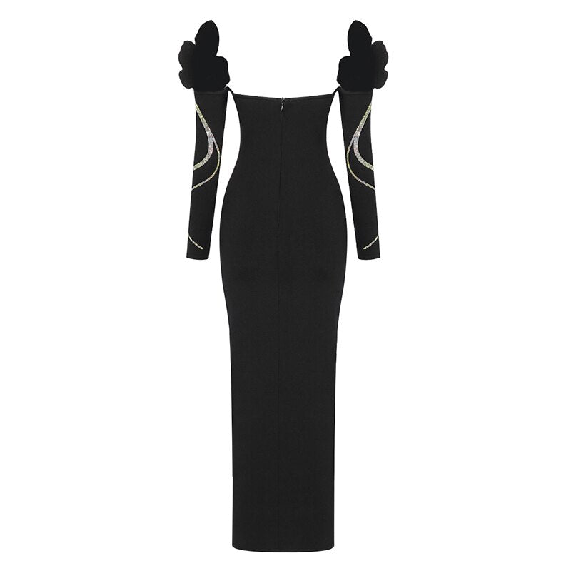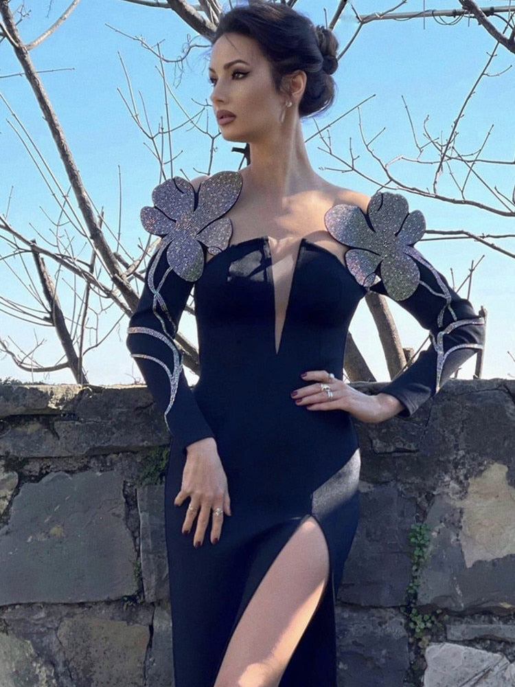 The Boom The Bass Long Dress is a one-of-a-kind dress designed to stand out. It features a solid black nylon construction, off-the-shoulder slotted detailing, and a dazzling rhinestone decoration. It is sure to be the talk of any gathering.