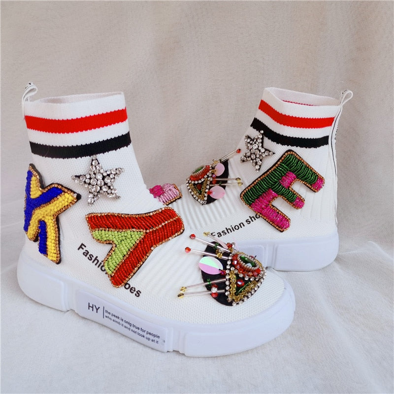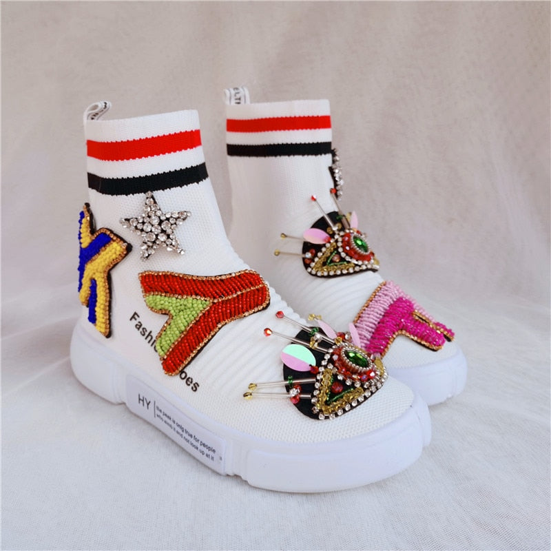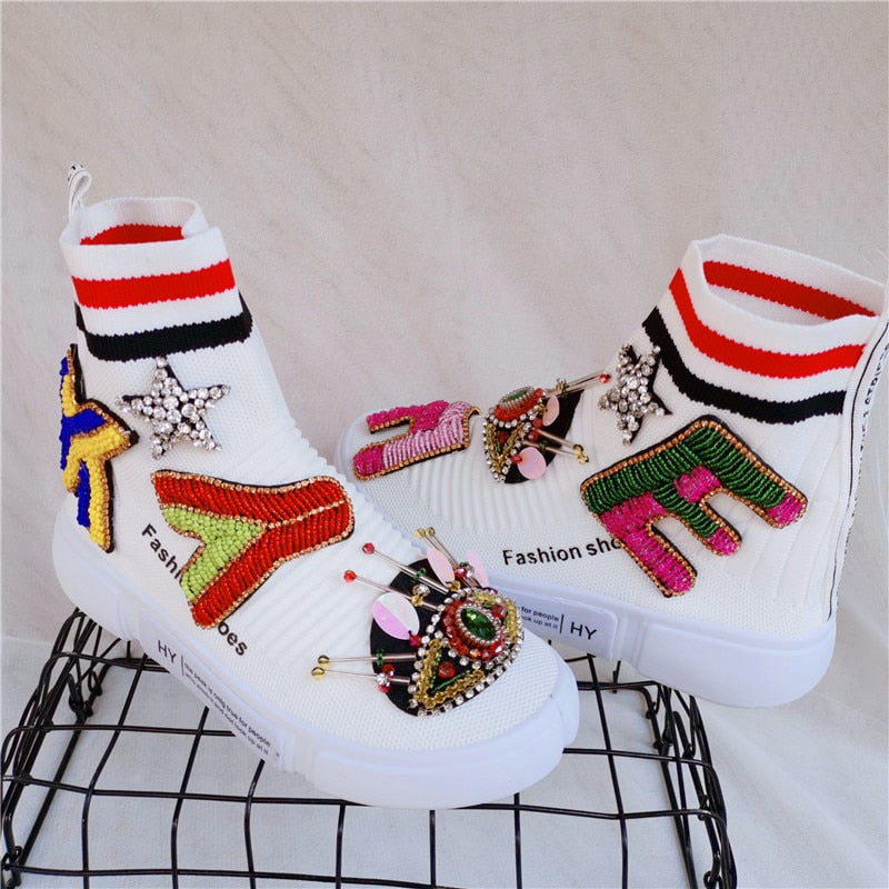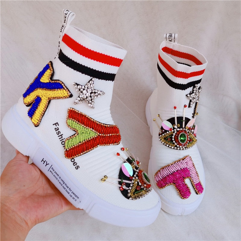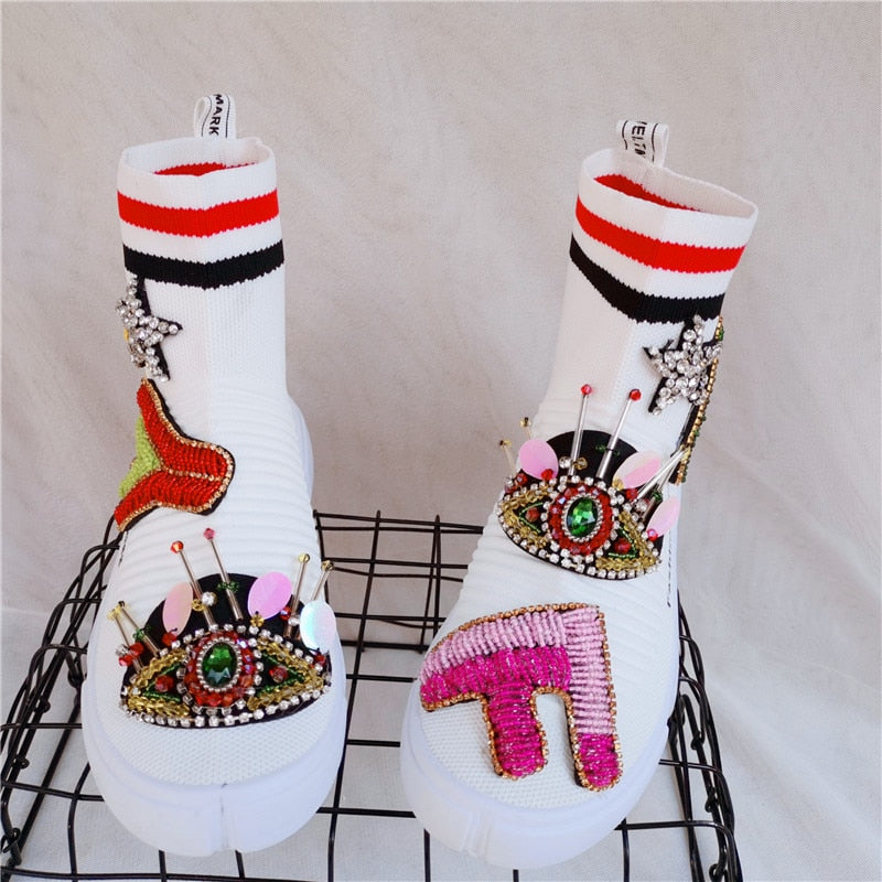 Round Toe Ankle Boot with Embroidery Decoration, Stretch Fabric, Cotton, and Rubber Material