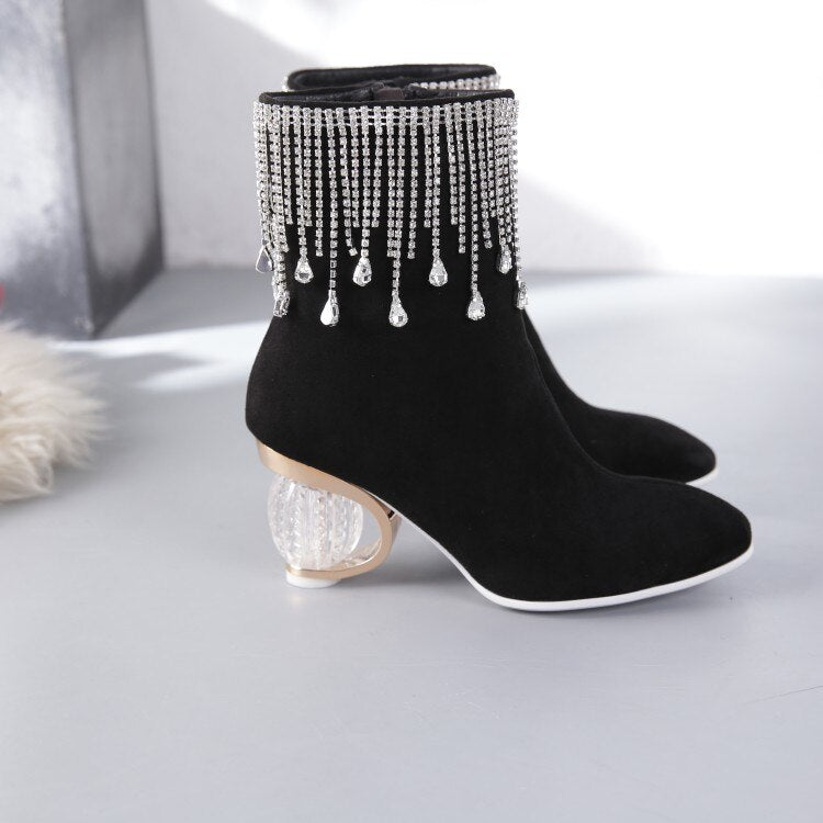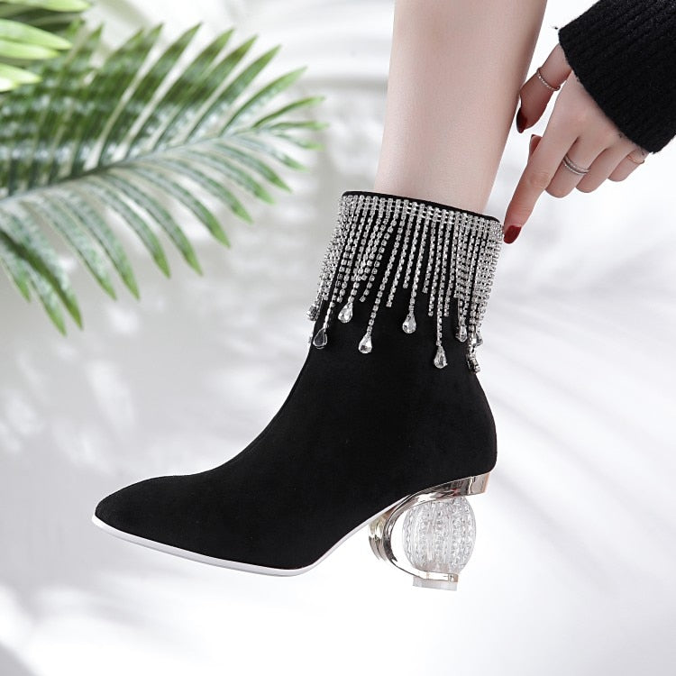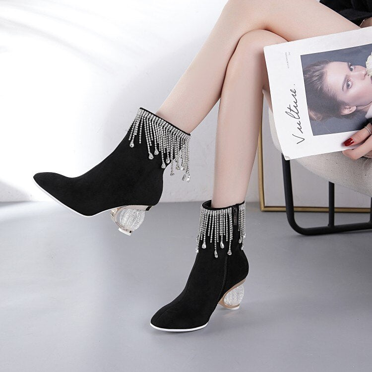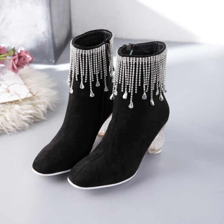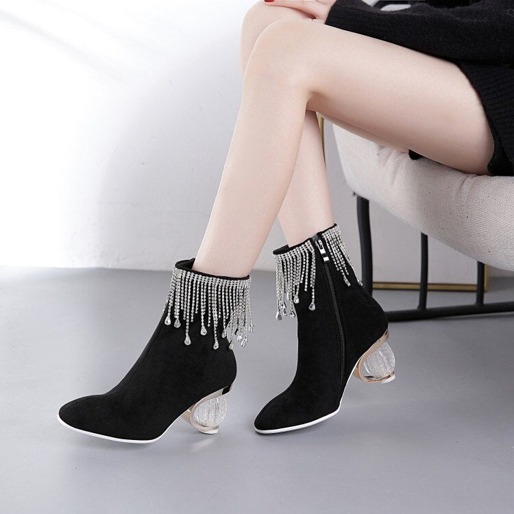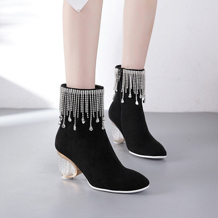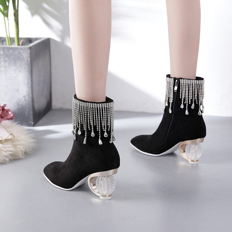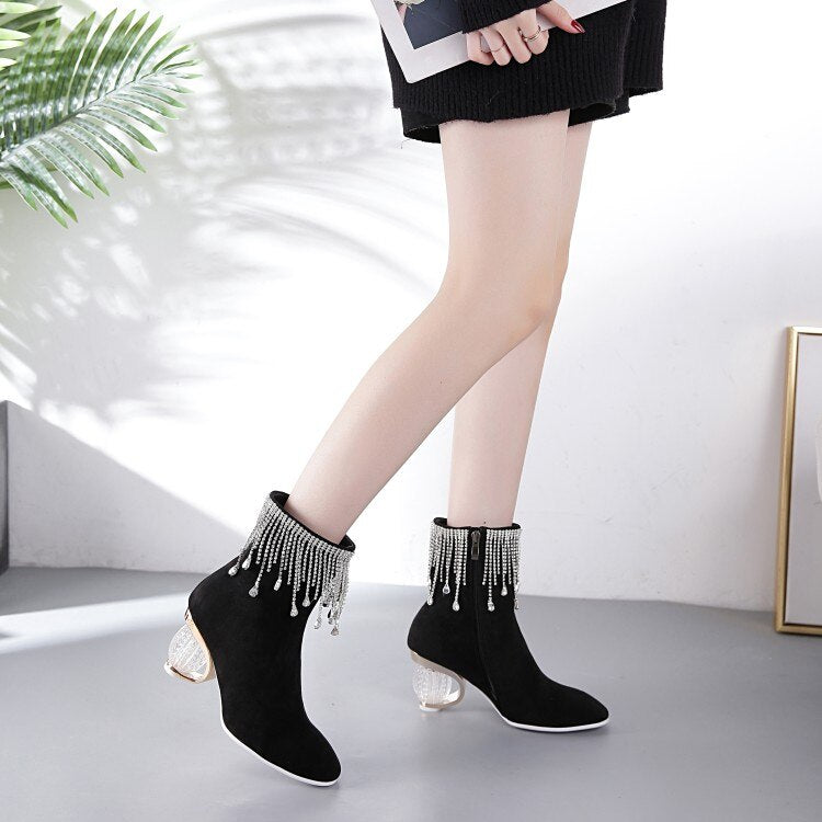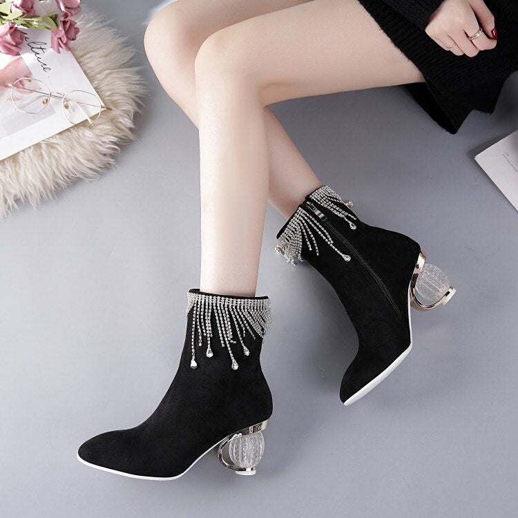 Fashionable and functional, these ankle boots with a bold and eye-catching design are perfect for everyday wear. Made of a flock material, the boots feature a round toe and a solid design. Rhinestone tassels decorate the vamp, while a sleek heel height adds a modern twist.