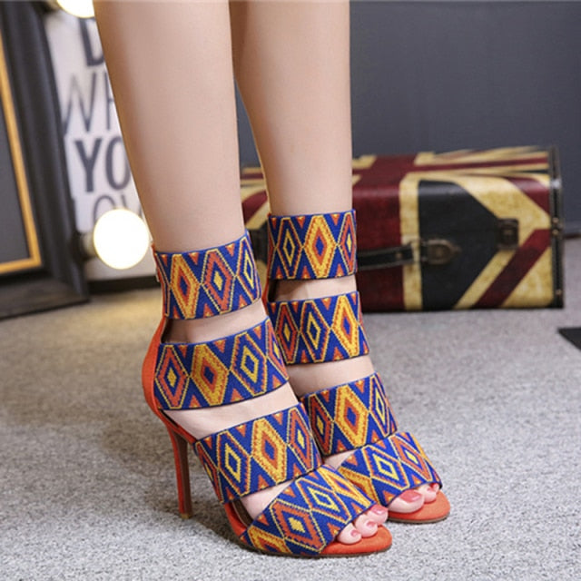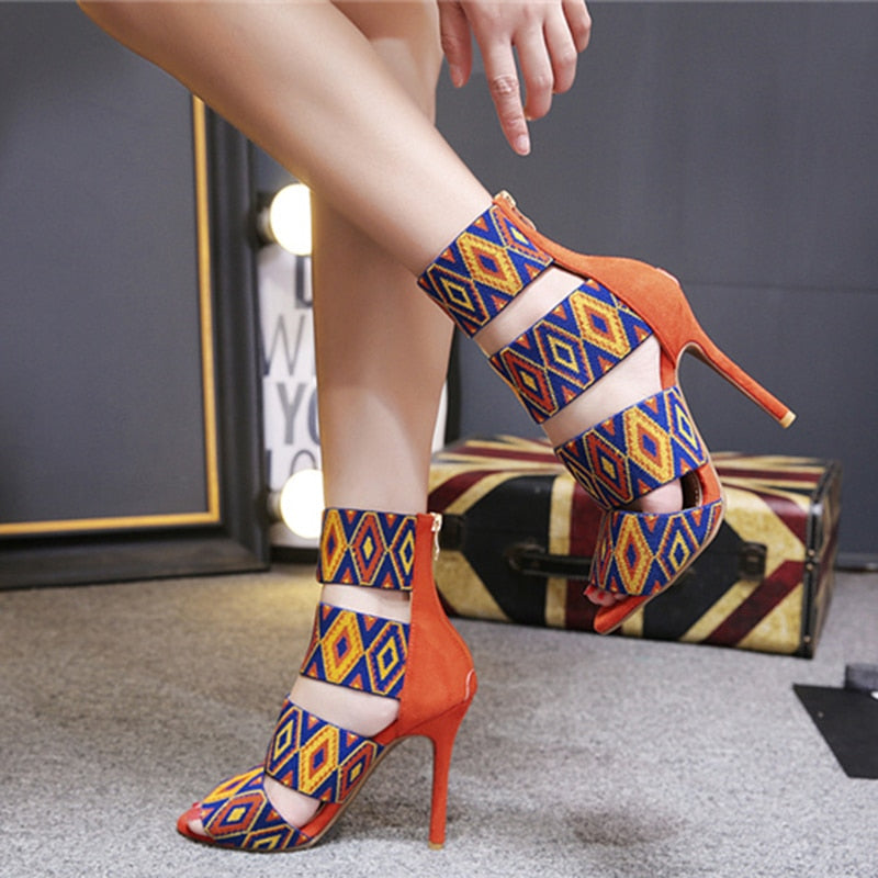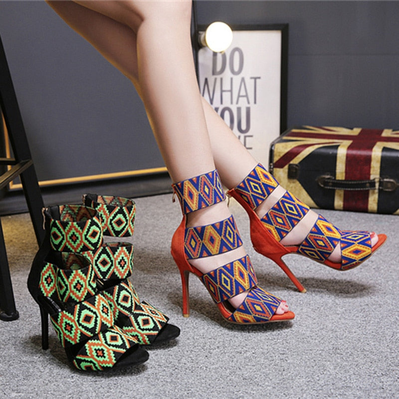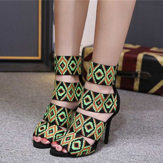 Sandalia con estampado geométrico con tacones finos y cierre de cremallera