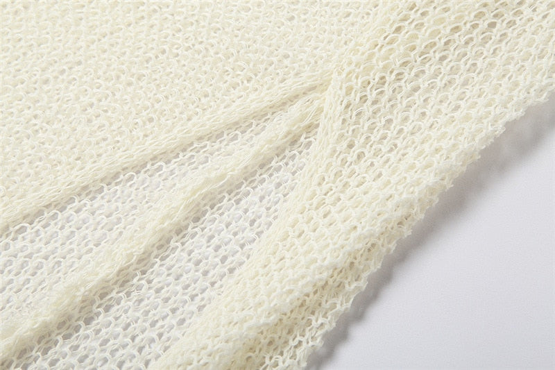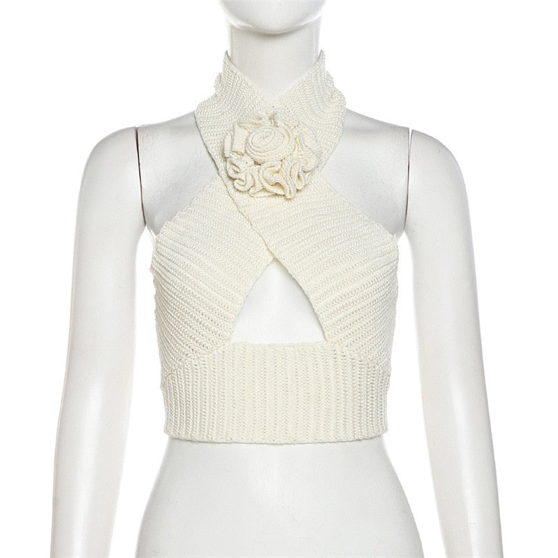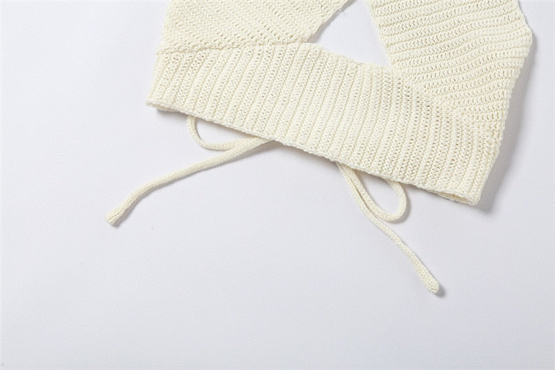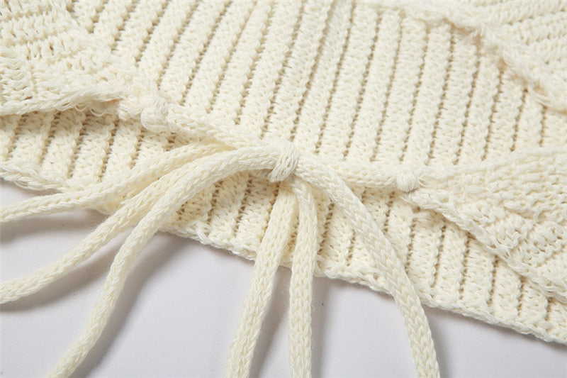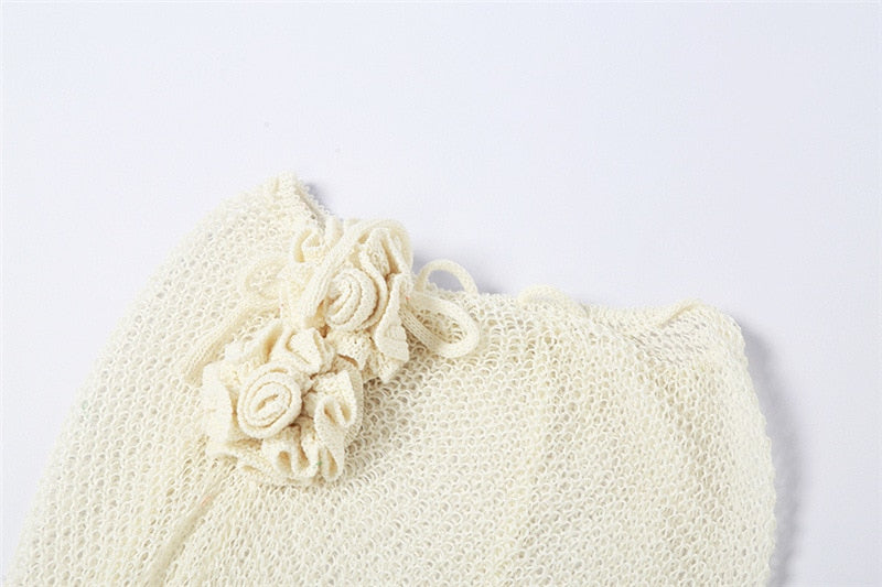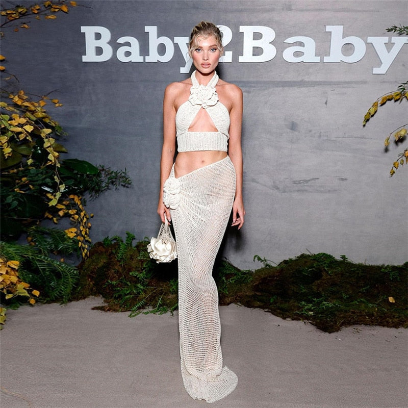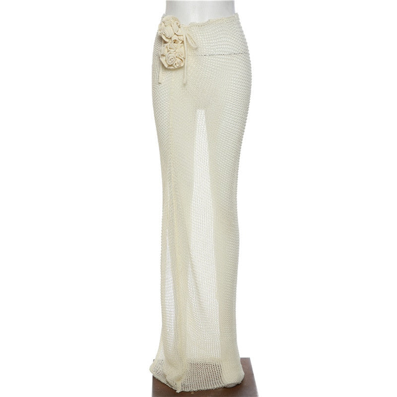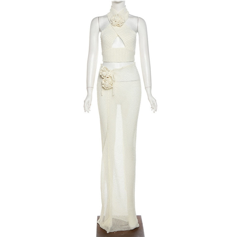 This two-piece top and skirt set crafted from beige-knitted fabric features a wrap-style crop top and a long sarong-style skirt, complemented by floral appliqués. A unique and modern look, while maintaining a sophisticated and timeless style. Perfect for special occasions and events when you want to make an impact.