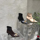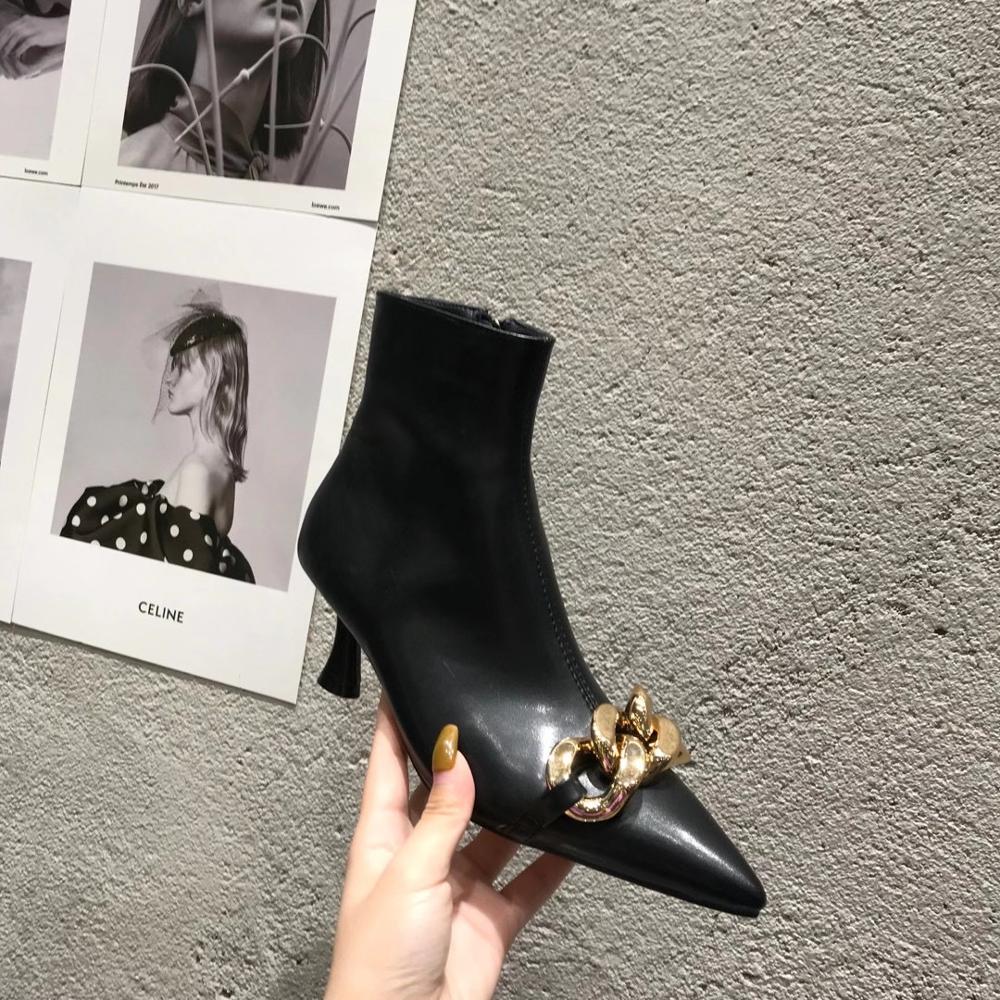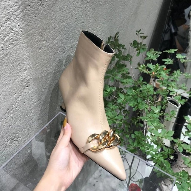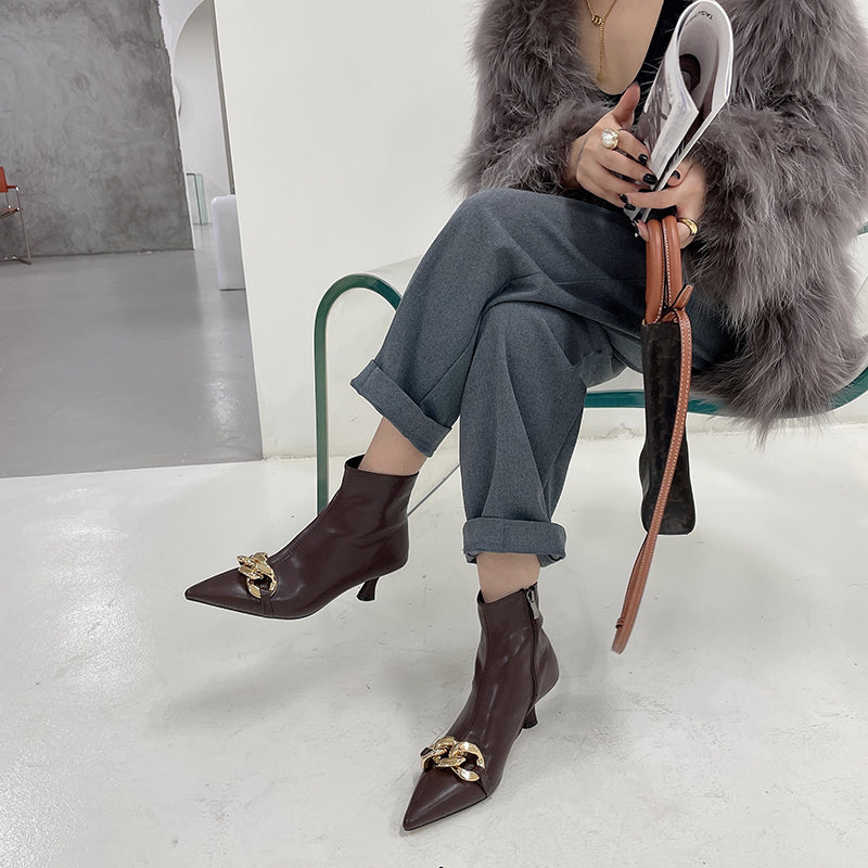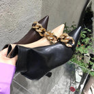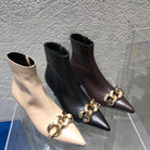 Botín con punta en punta con decoración de cadena, patrón sólido, cierre de cremallera, caucho y material de PU