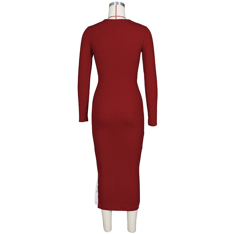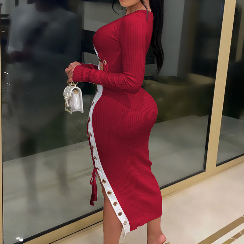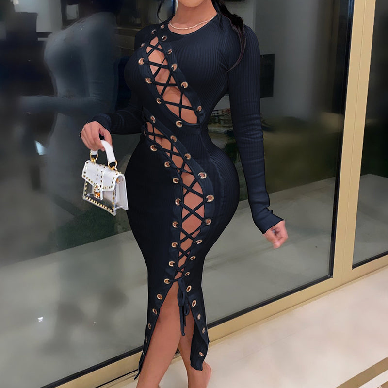 Vestido midi ahuecado de manga larga con decoración de cordones en la parte delantera