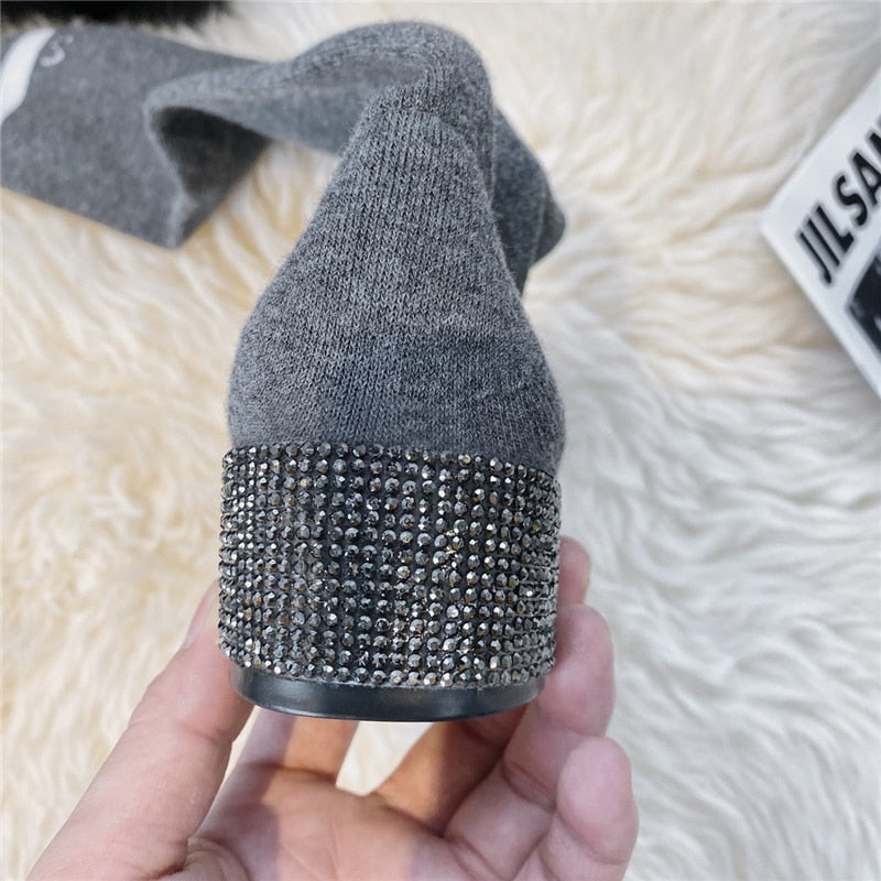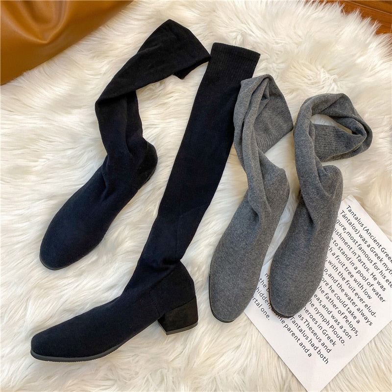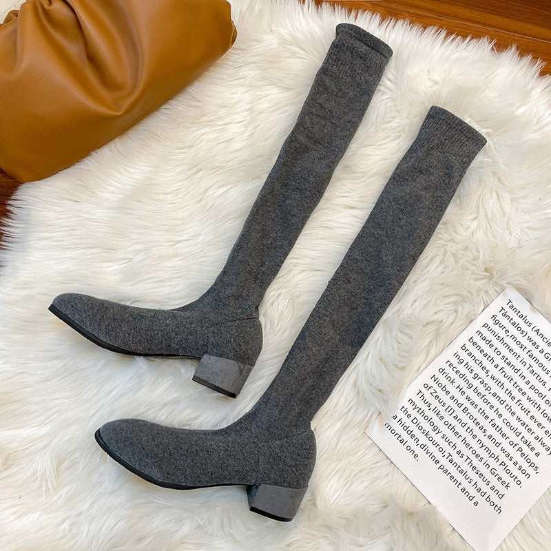 Botas sólidas sobre la rodilla con punta cuadrada, tela elástica y material de goma