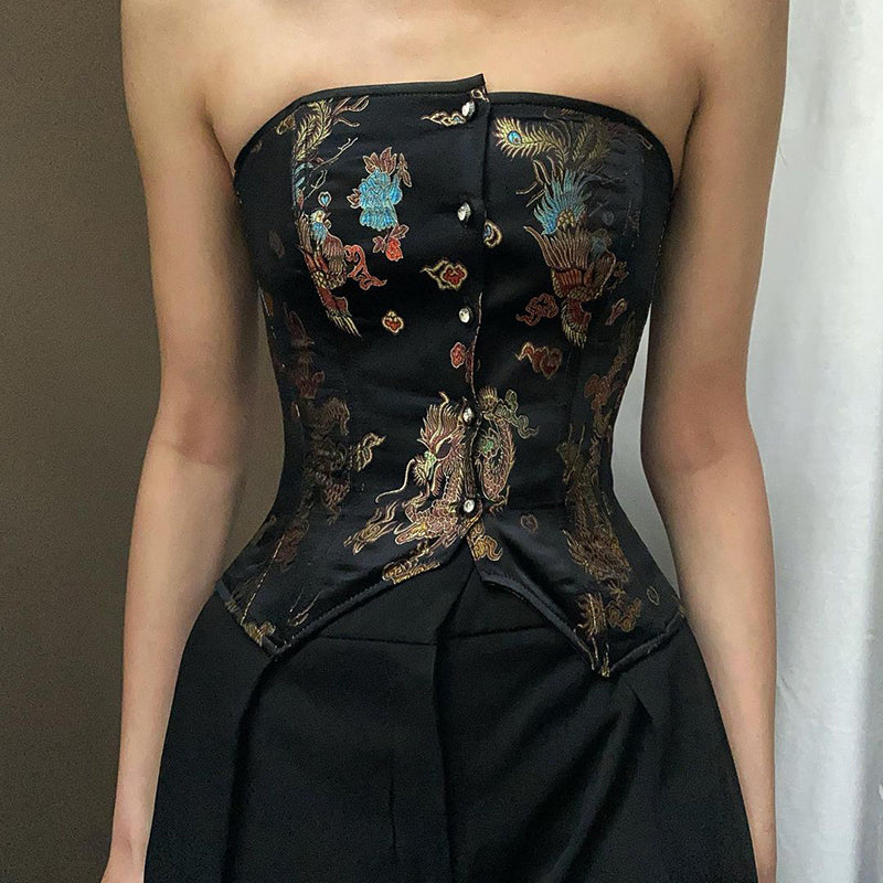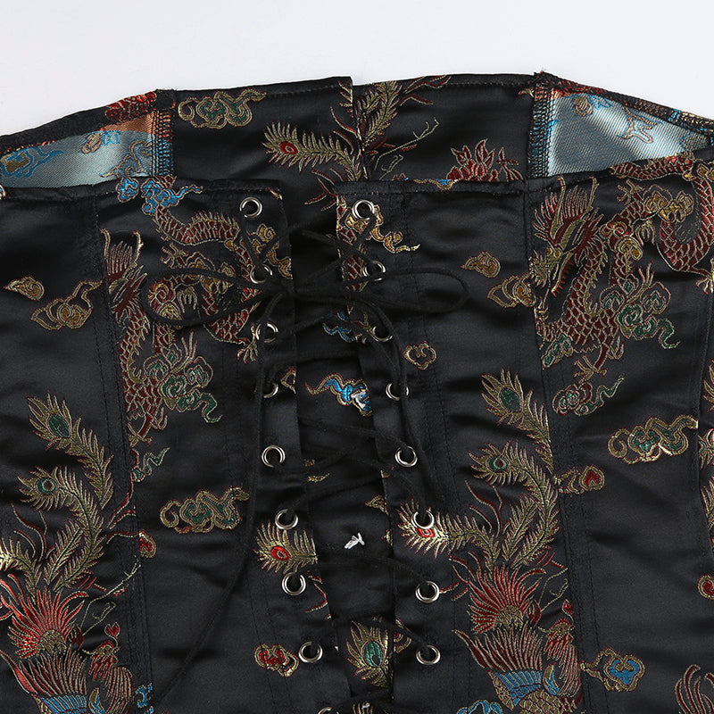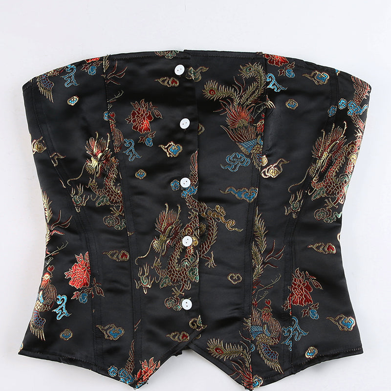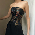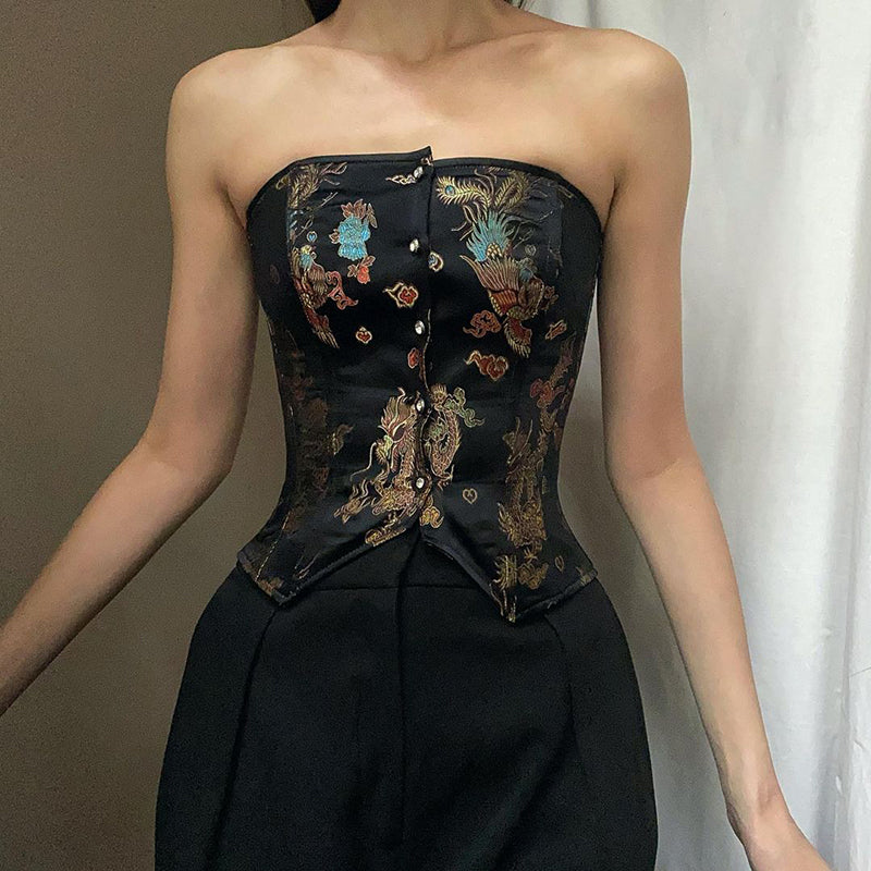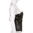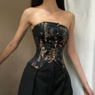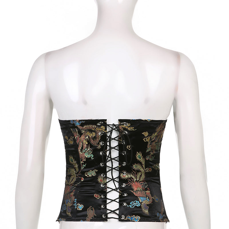 This strapless corset top is perfect for any occasion. The top is sleeveless and has a lace-up closure for a flattering and supportive fit. The top is made of polyester and has a geometric printed pattern.
