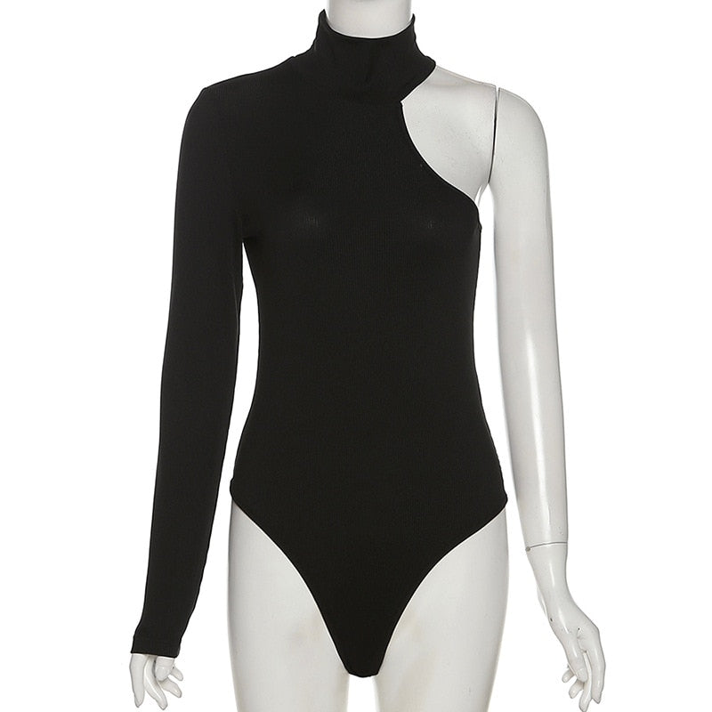 This black bodysuit is perfect for a night out on the town or a day of shopping. It features a turtleneck and one-shoulder design. This bodysuit has a solid black color.