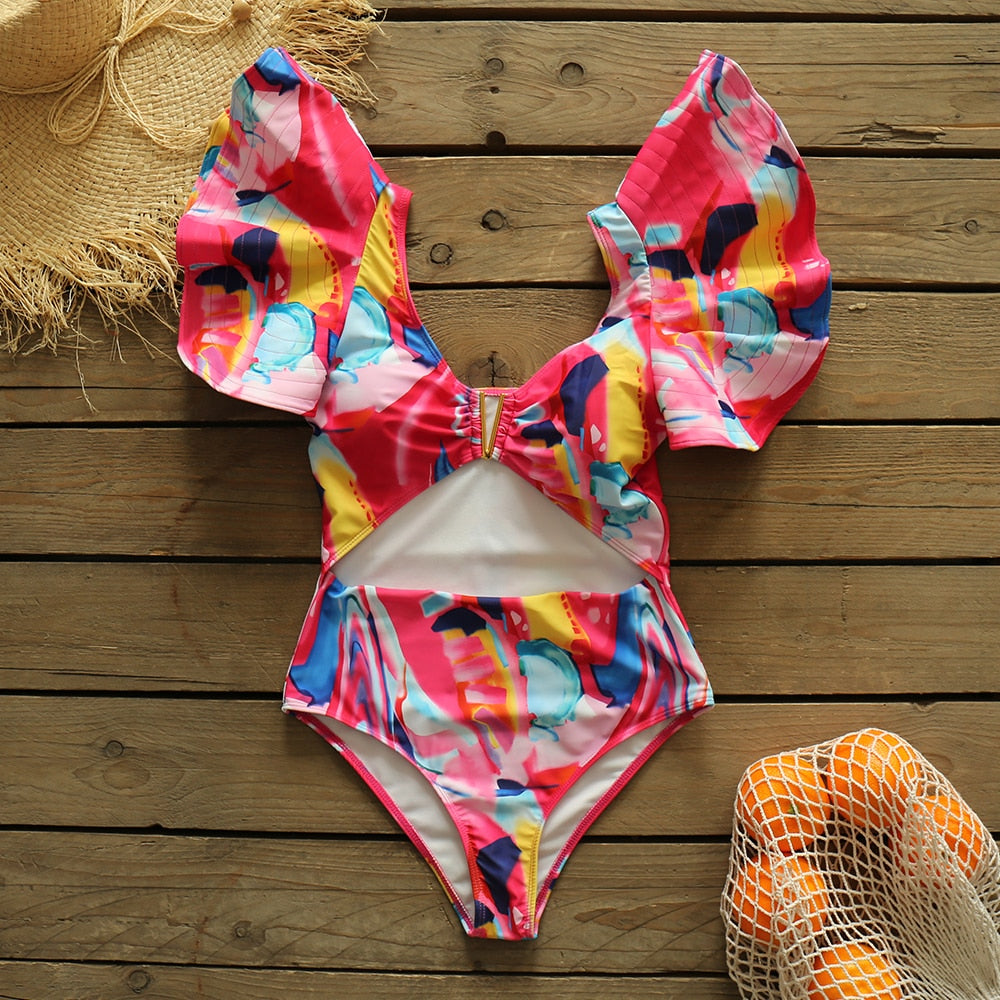 If she's looking for a chic and sexy swimsuit to look her best, this is a perfect choice. Sexy in its pink and geometric print, this monokini comes in a variety of styles and fits any occasion. The ruffles provide a feminine touch and the hollow-out design sculpts the body for a sleek look.