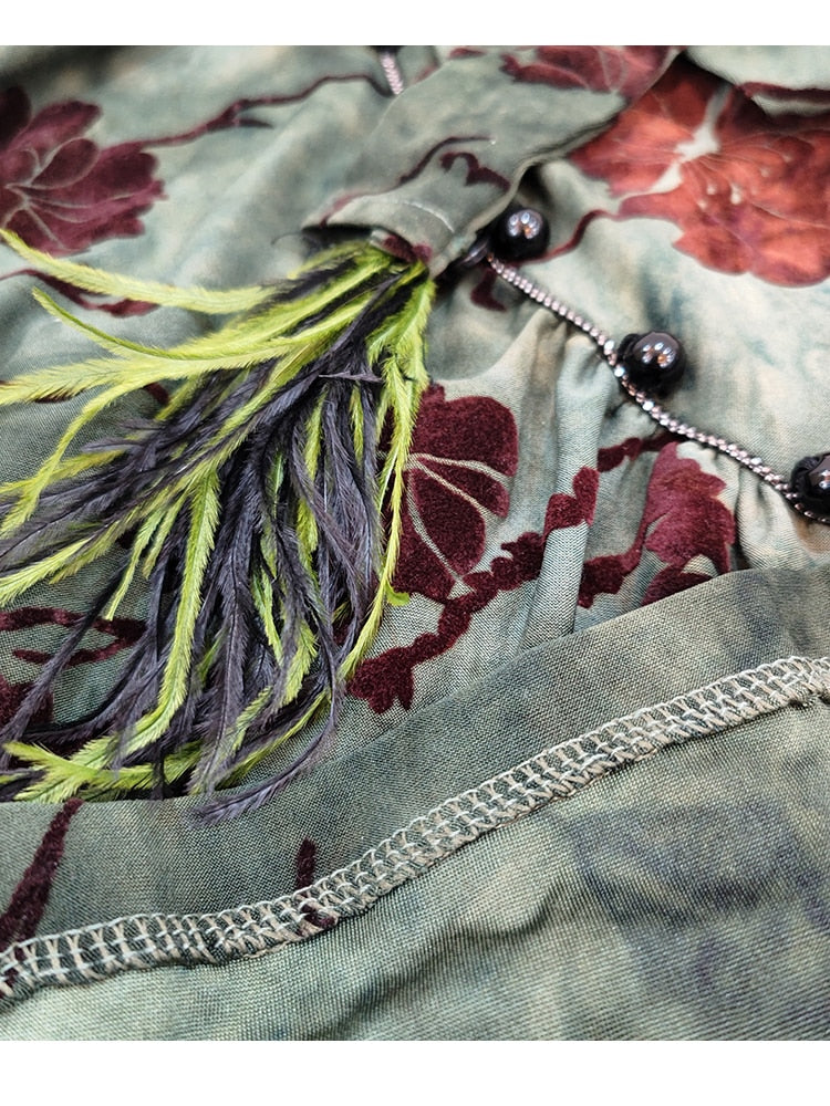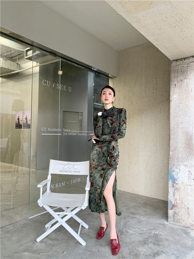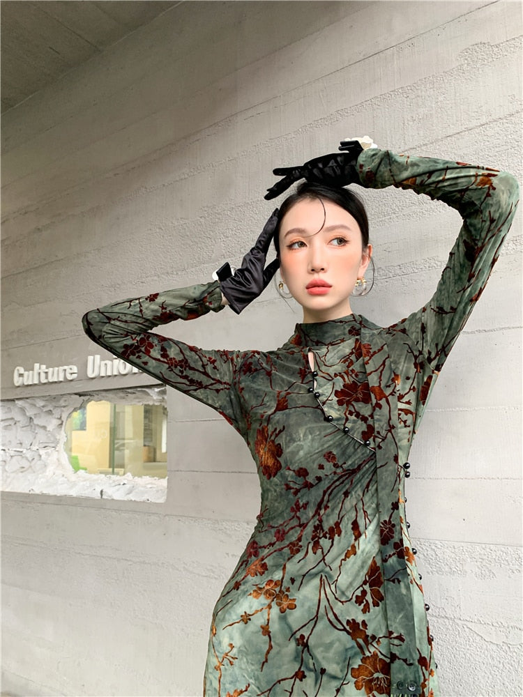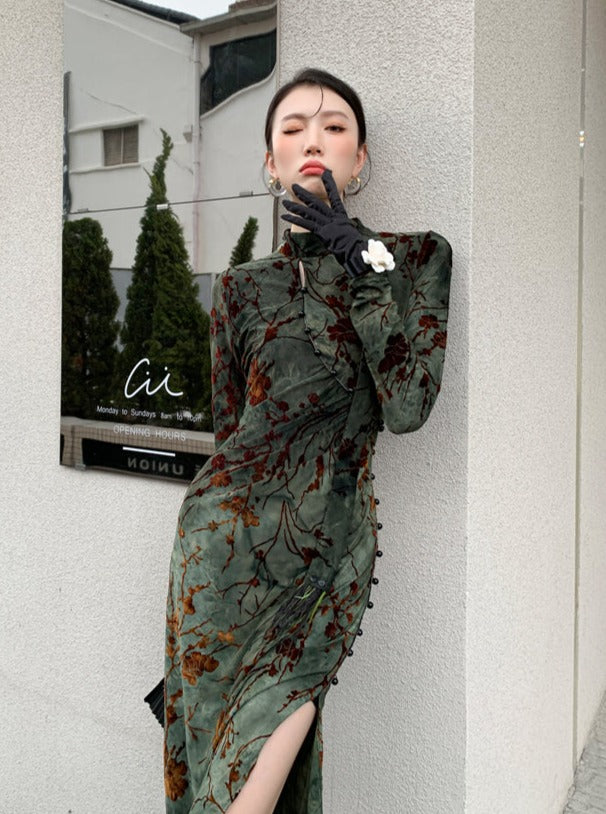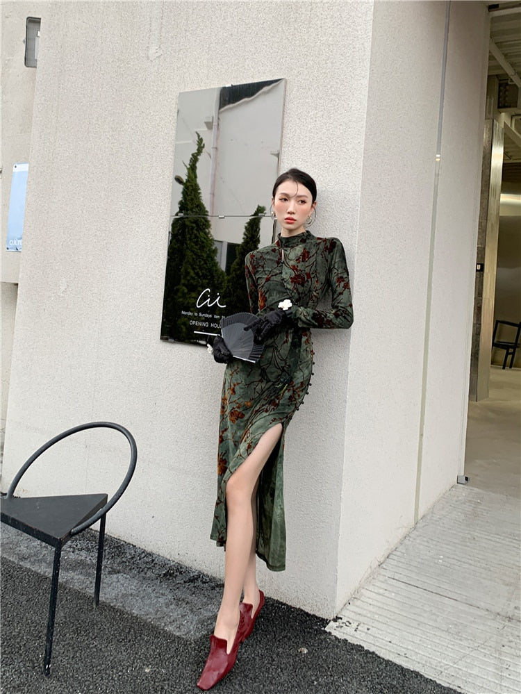 Dress up your everyday look with this grey vintage velvet midi dress. It features a high neckline and long sleeves. The skirt has a side slit and a floral vine pattern. Pair with your favorite heels and a simple clutch for a classy and elegant ensemble.