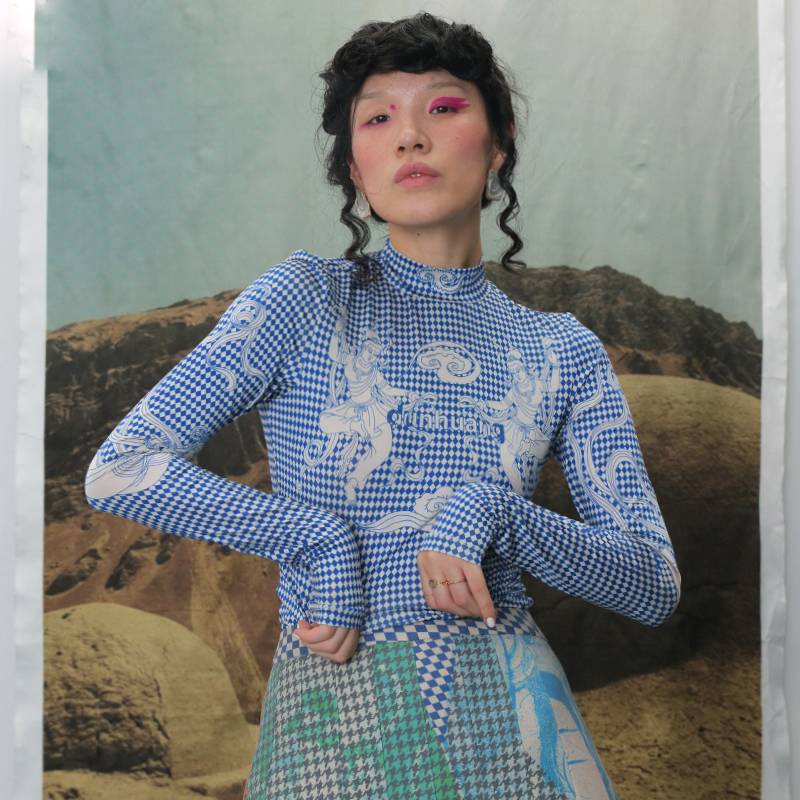 Jersey de algodón en camisa con estampado de cuadros de cuello alto y manga completa