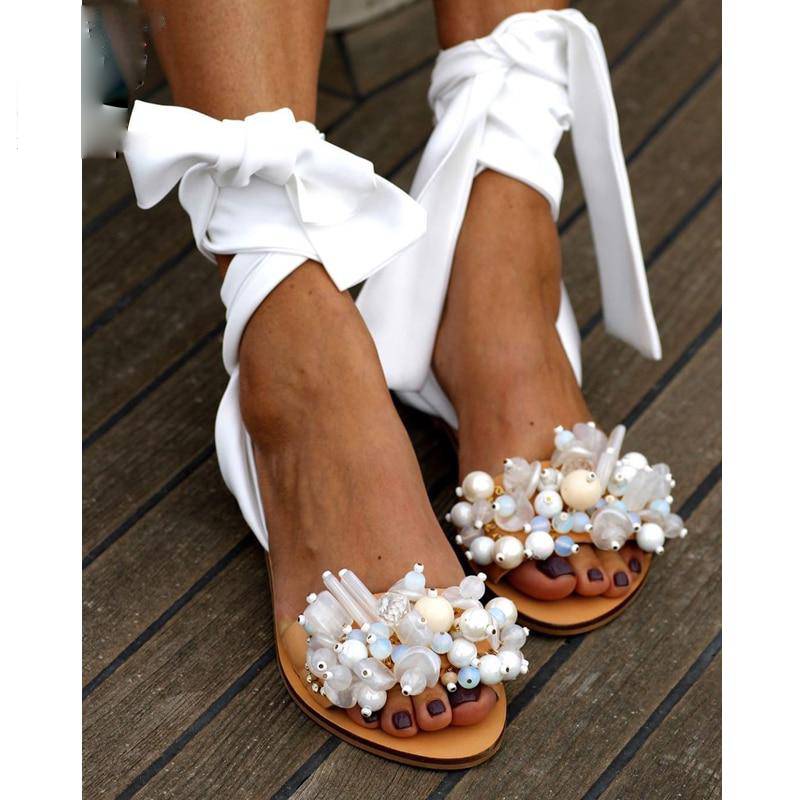 <transcy>Sandalia plana con cuentas y correa de tobillo hecha a mano</transcy>
