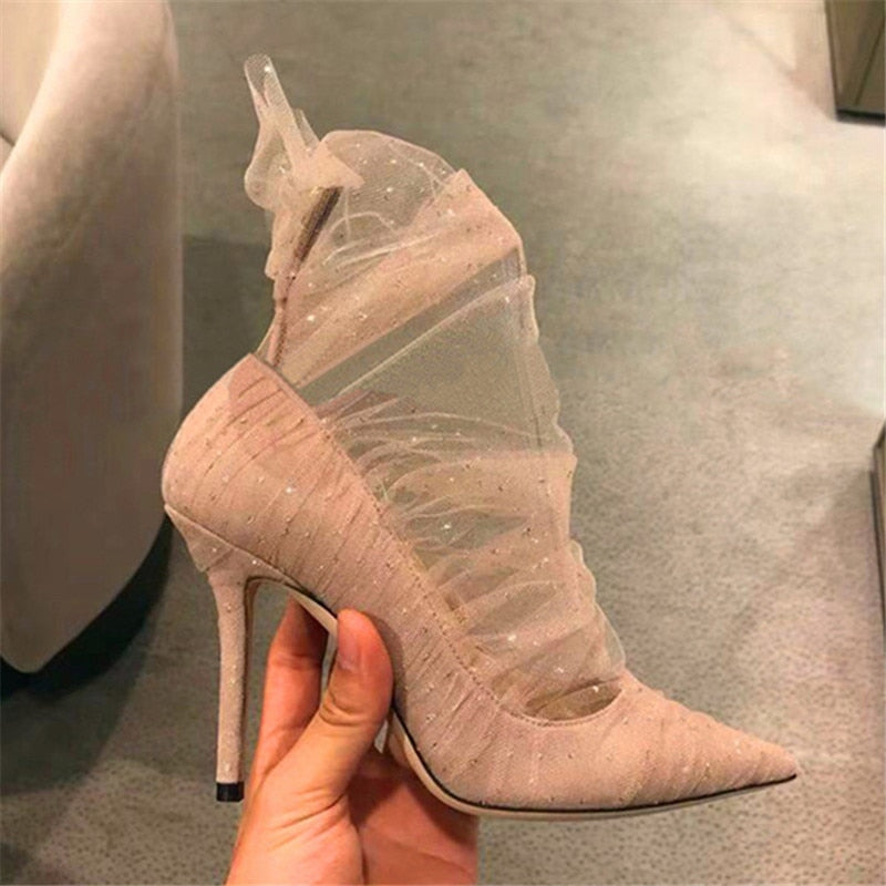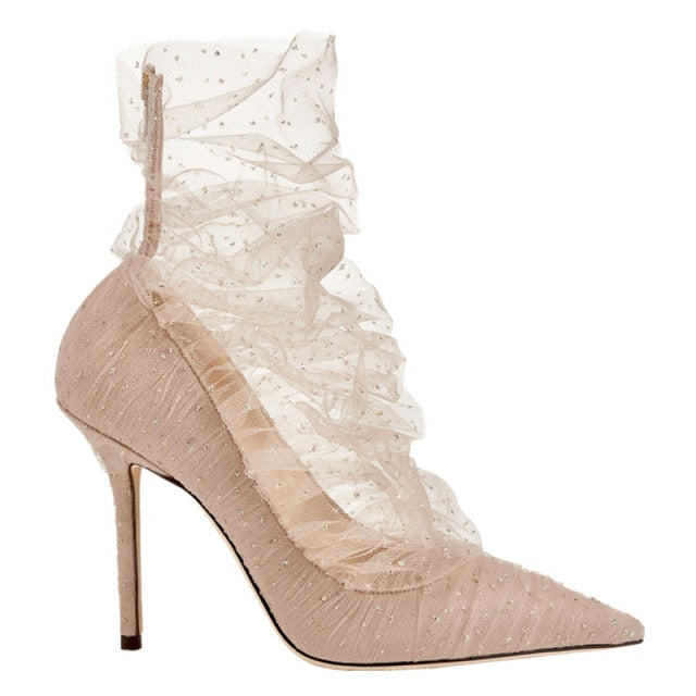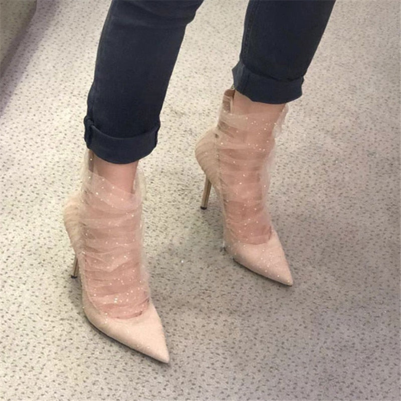 Stiletto en punta con encaje transparente y cierre de cremallera