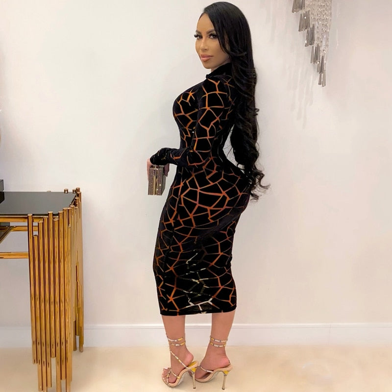 Cool and confident, this geometric patterned dress is perfect for the office or special occasions. The mid-calf length will keep you cool during the warmer months, while the mesh polyester keeps you comfortable without sacrificing style. The long sleeves add an element of style while keeping your arms warm. Cool and confident, this geometric printed dress is perfect for the office or special occasions.