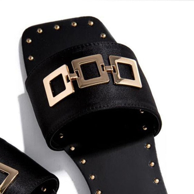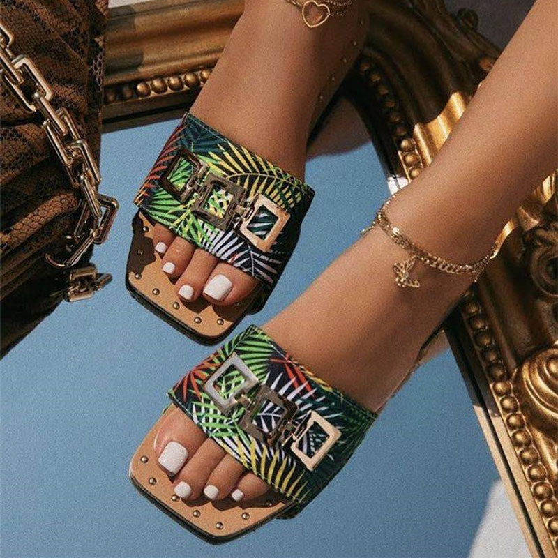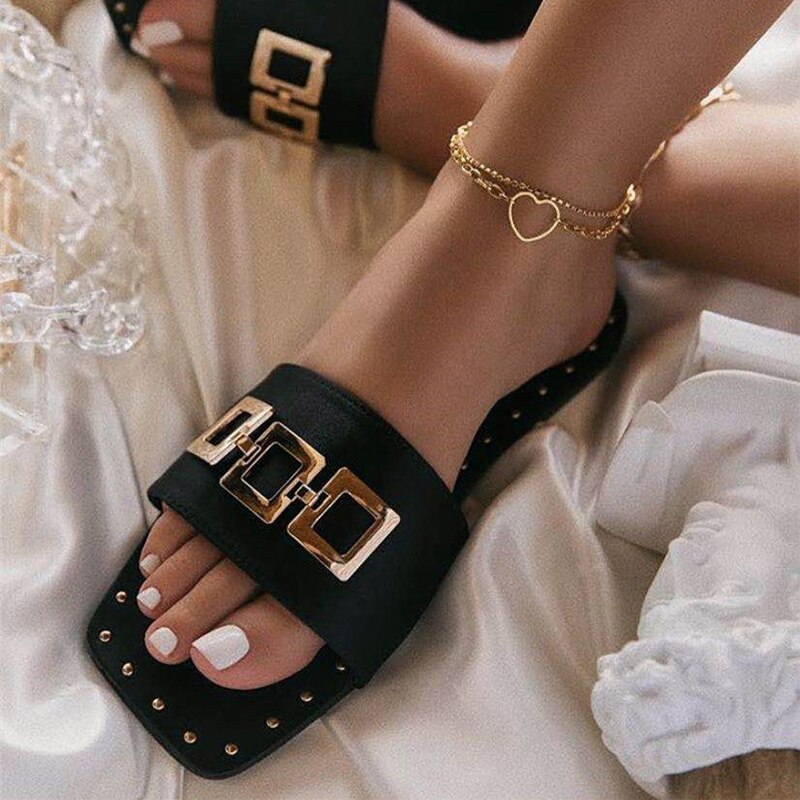 Sandalia tipo pantufla de piel sintética sin cordones con decoración de hebilla