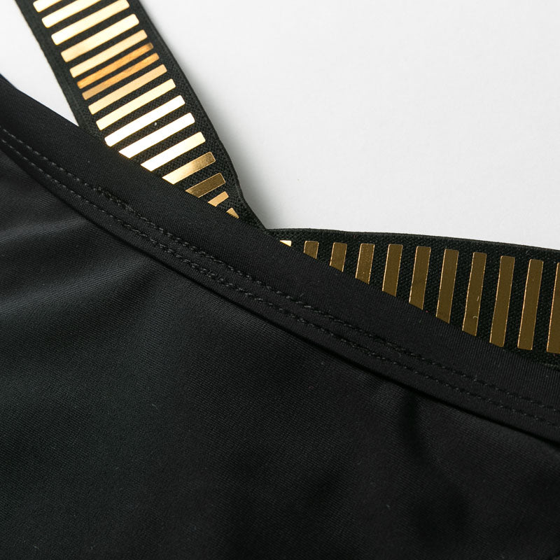 With a chic, minimalist aesthetic, this two-piece bikini is the perfect addition to your wardrobe. The black, solid-colored fabric features a strap decoration in a golden stripe pattern that is sure to complement any beach day look.