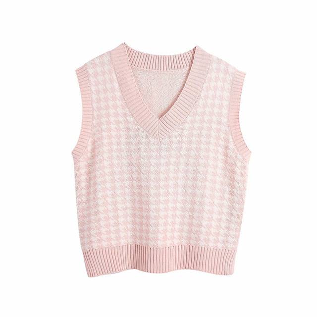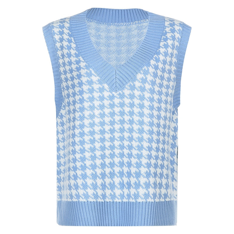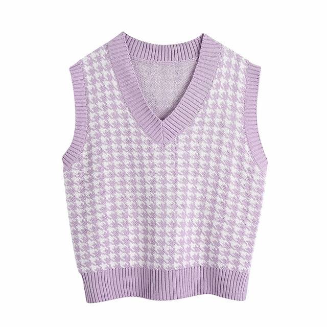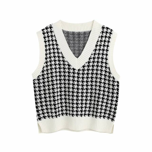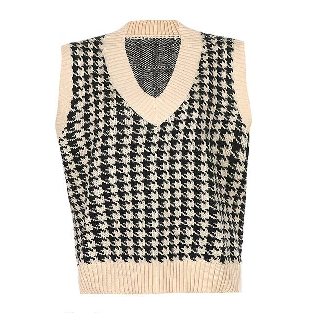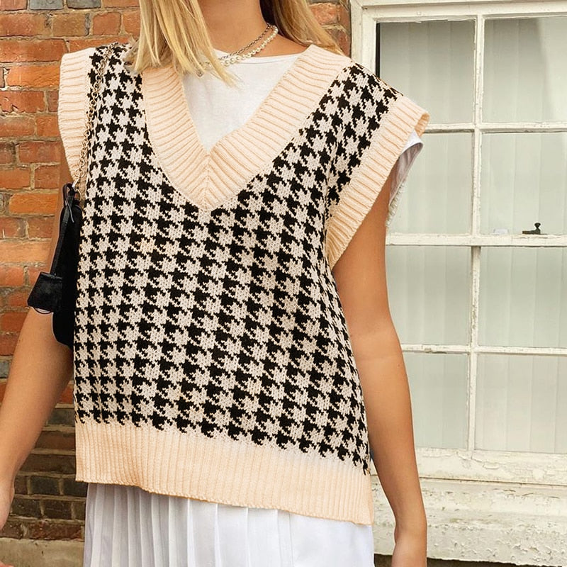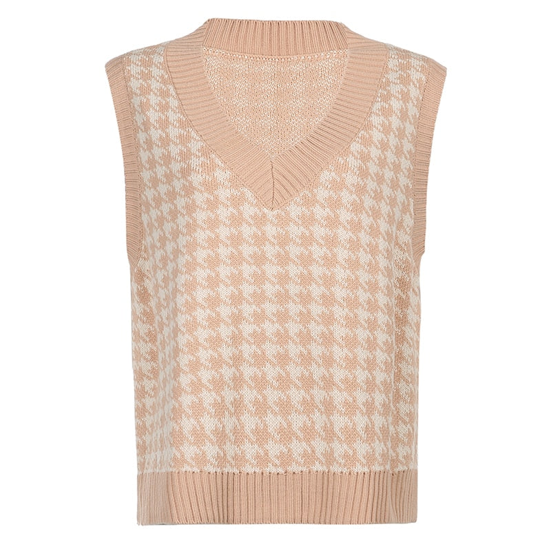 Chaleco de punto casual con estampado de pata de gallo, sin mangas, escote en V y material acrílico