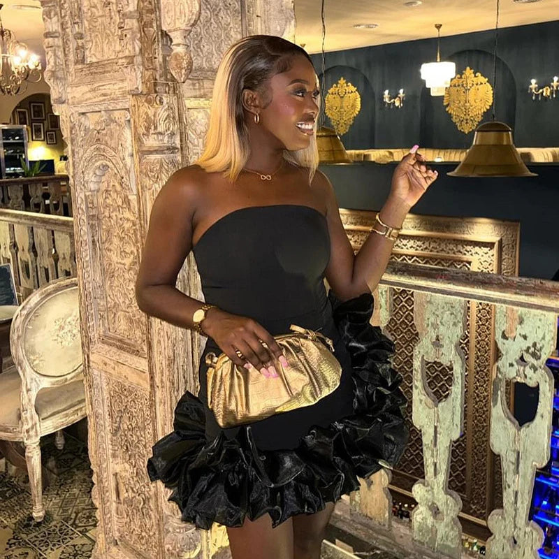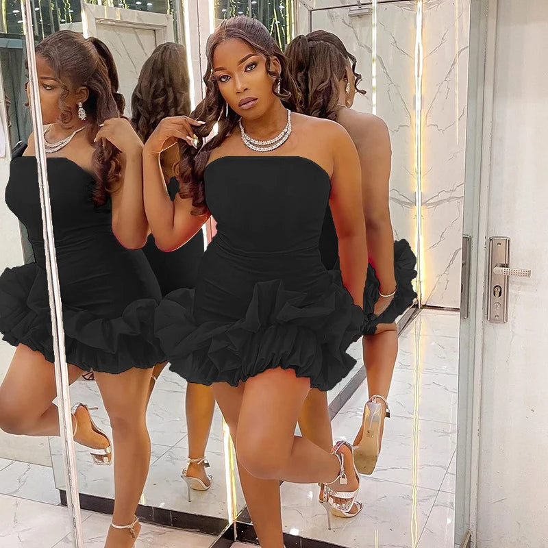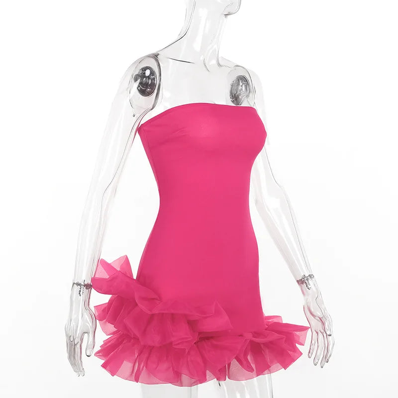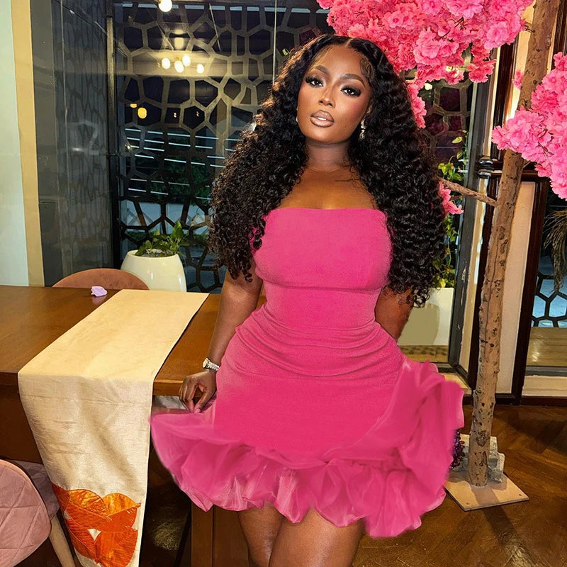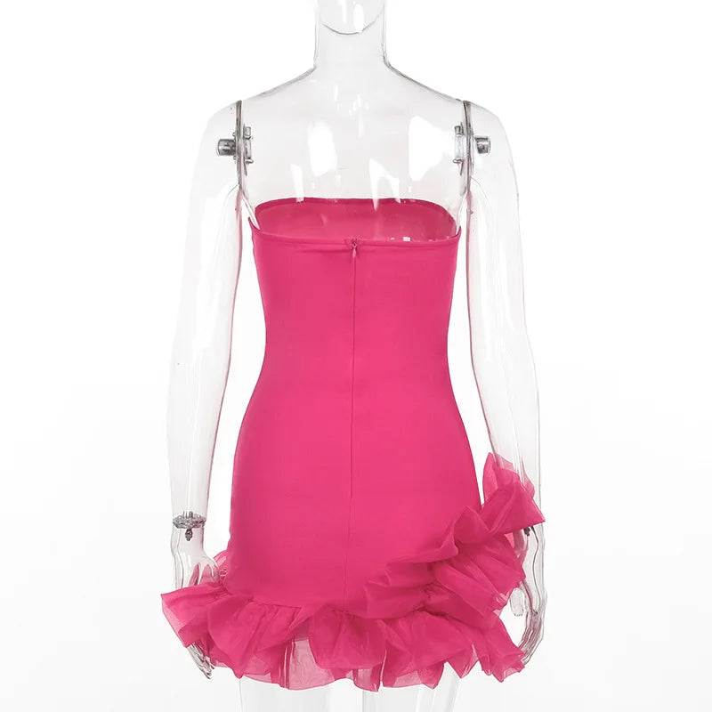 The Wait 'Till You See Me Mini is a slim-fitting ball gown with a strapless neckline and intricate lace detailing. Made with a blend of cotton, polyester, and mesh, this dress is above knee length, perfect for showing off your legs. Get ready to turn heads with this stunning solid-colored dress.