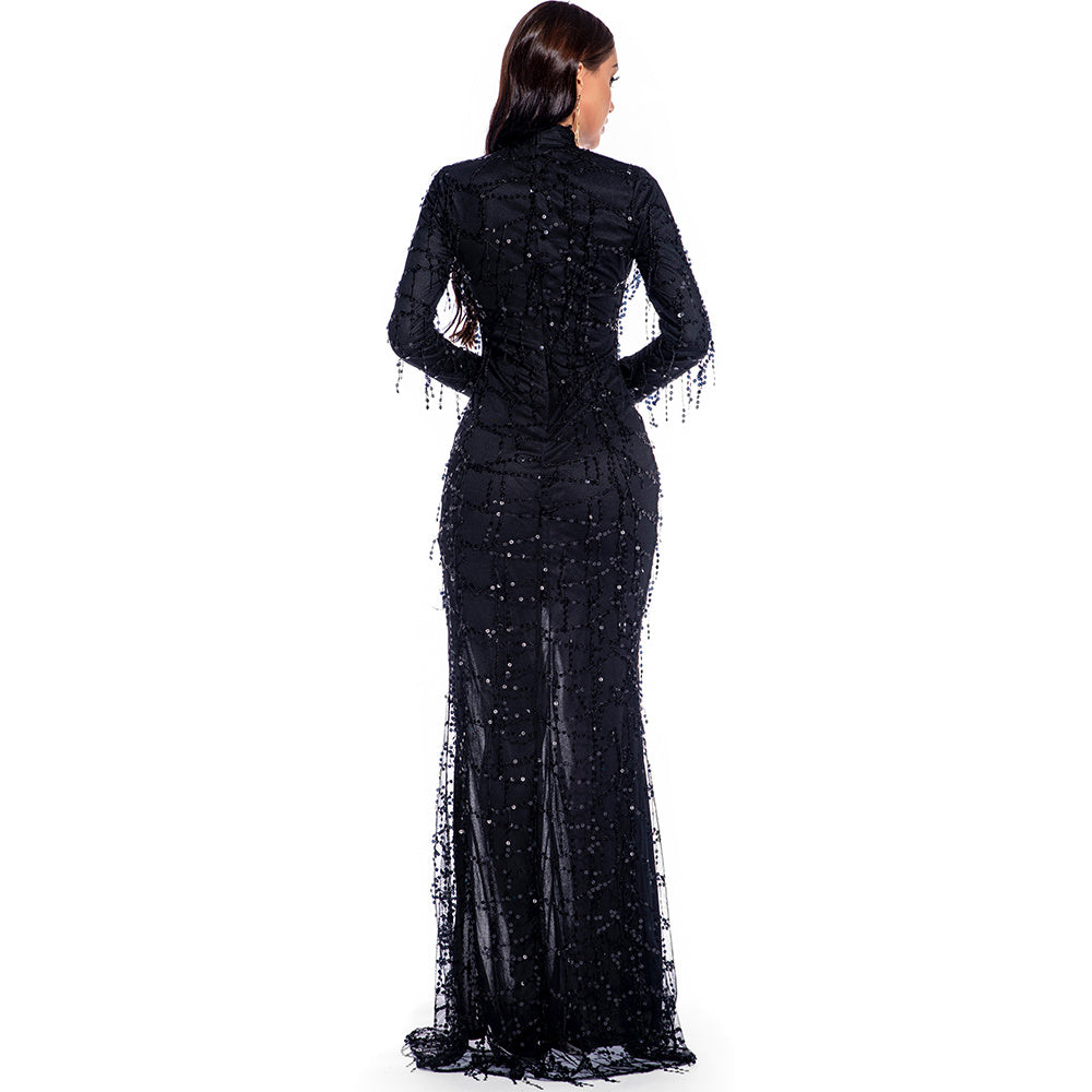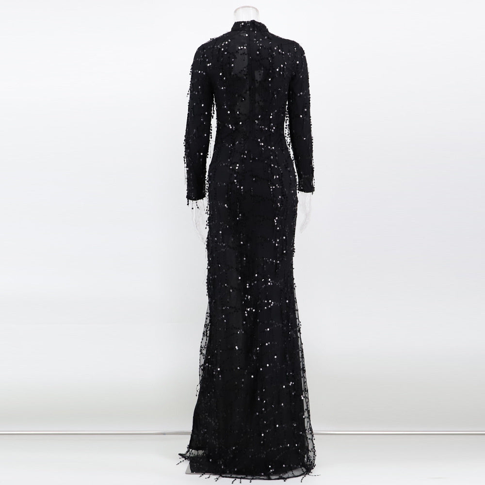 Este sexy vestido largo está hecho de poliéster y lentejuelas, lo cual es ideal para usar en una fiesta. El vestido es transparente y presenta una abertura en la parte delantera. El vestido tiene mangas largas y cuello de tortuga.