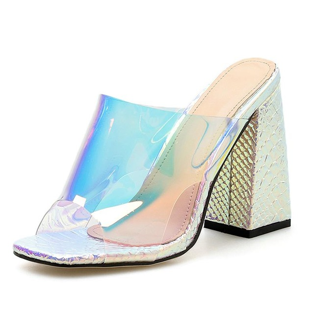 Zapatos de tacón de PVC con tacón grueso y estampado animal y correa transparente
