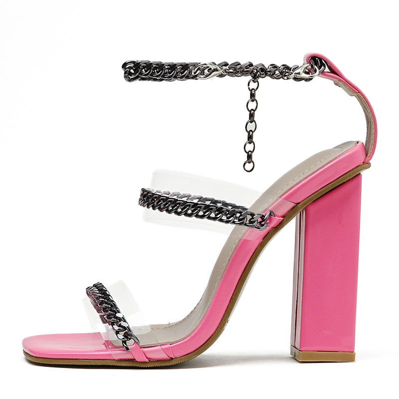 Sandalia de tacón cuadrado con correa de tobillo y eslabones de cuero PU