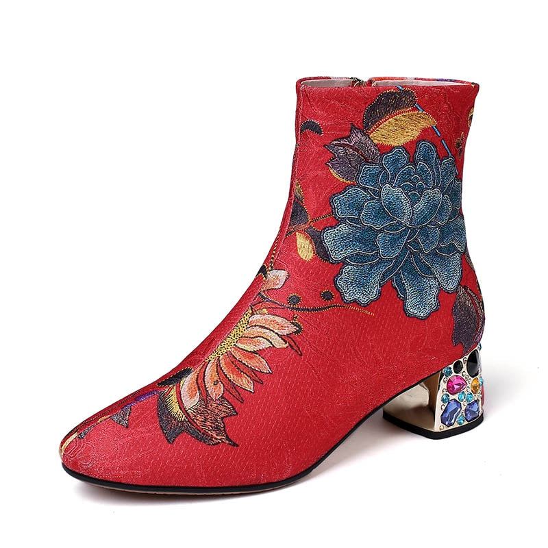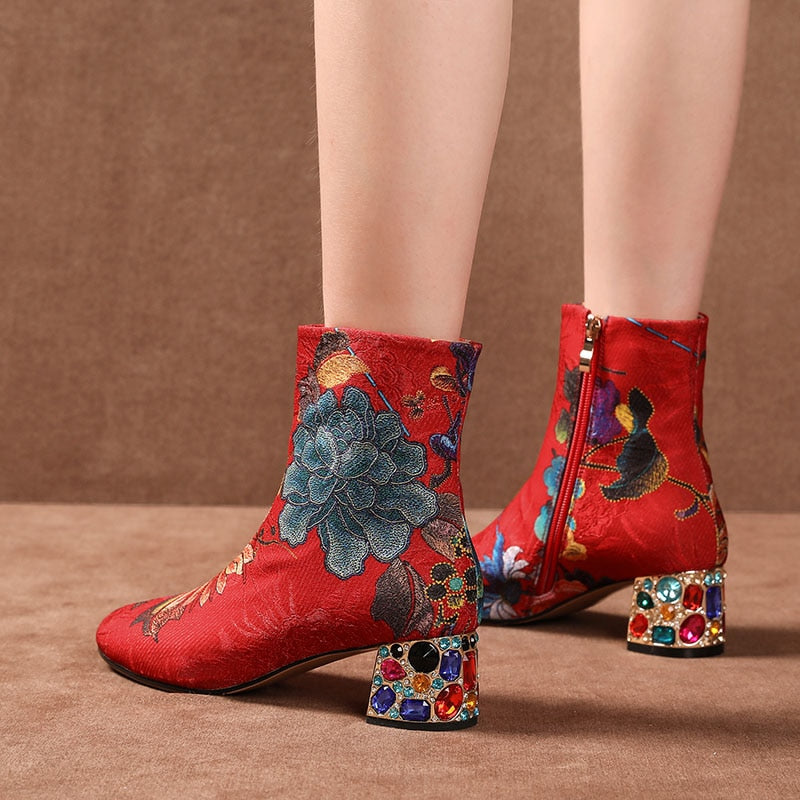 Floral Pattern Ankle Boots with Zipper Closure and Rhinestone Decoration on the Heels