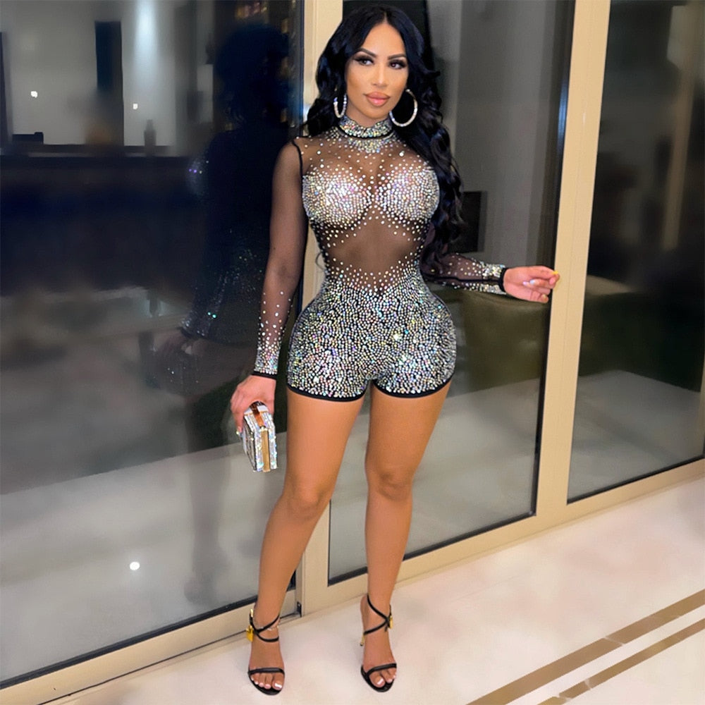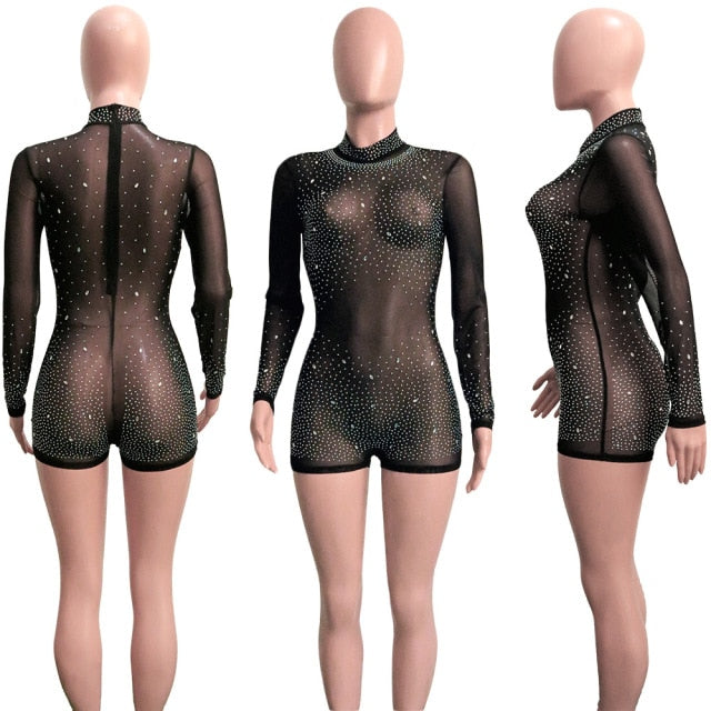 Fashionable and sophisticated, this romper is perfect for any day of the week. The long sleeves and mesh polyester are great for keeping you cool in the summer heat. The rhinestones give this romper a little something extra to make it special.