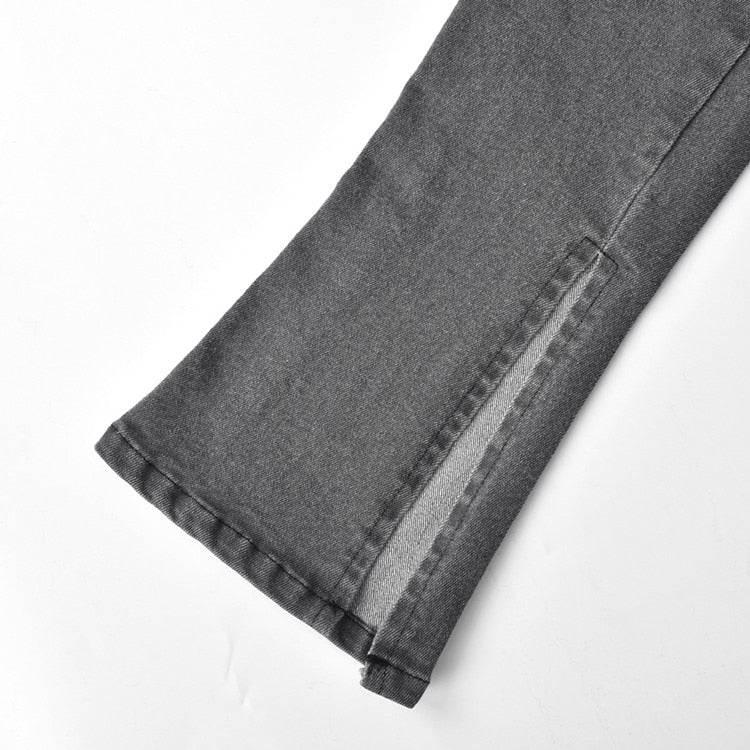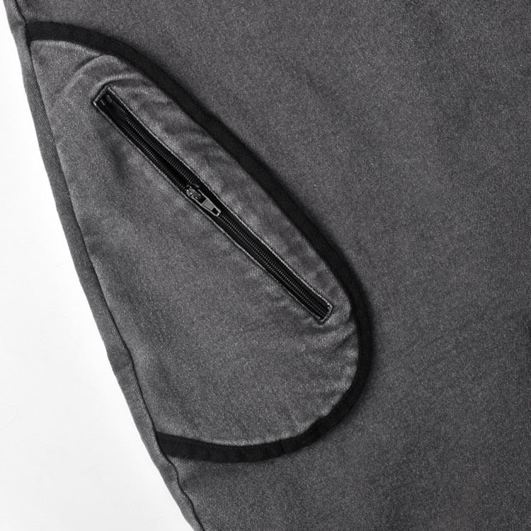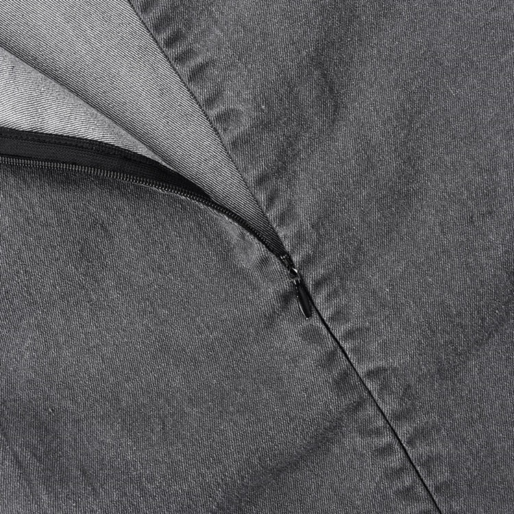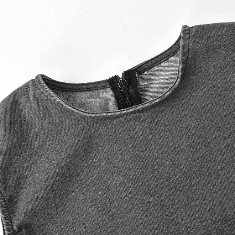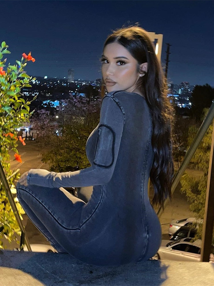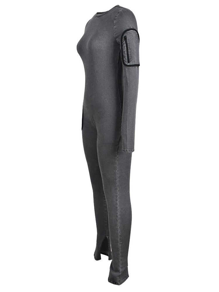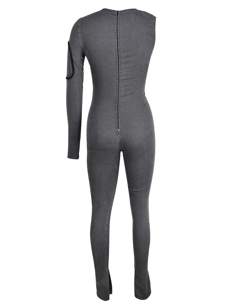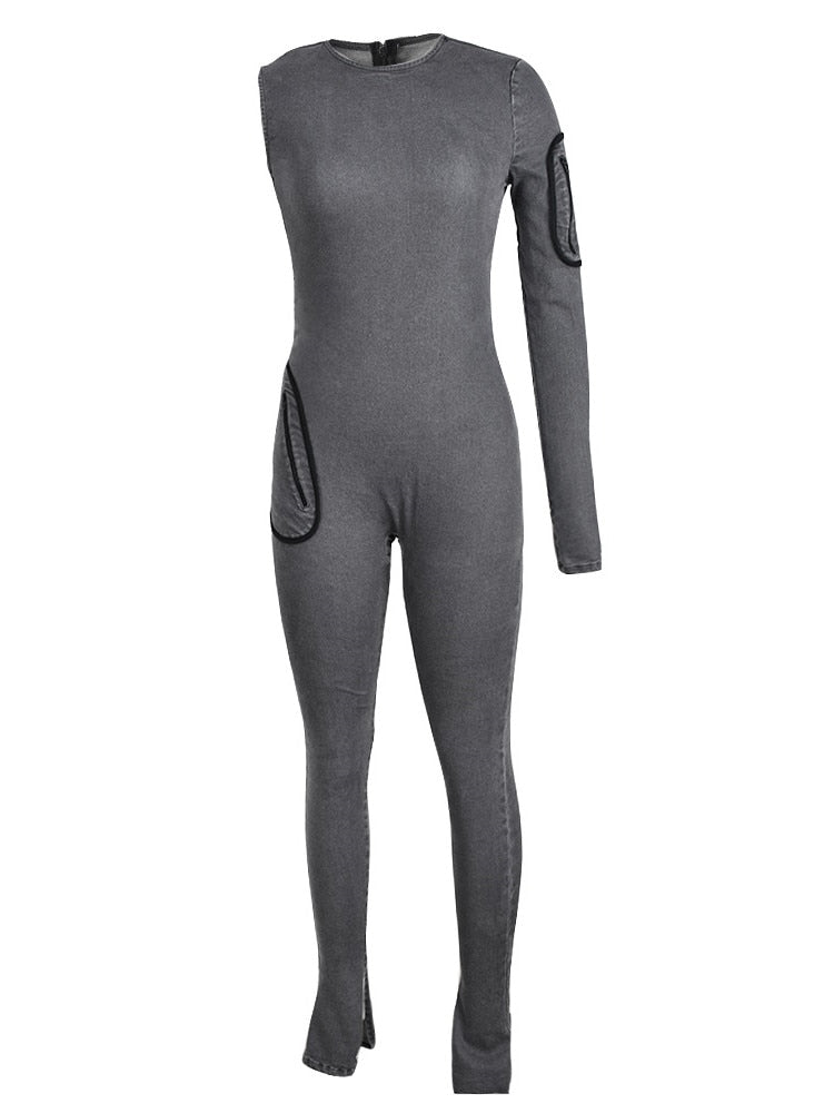 The jumpsuit is made of dark denim material, and it has a solid color with a grey o-neck. The design is one shoulder, with an o-neck design. The jumpsuit is perfect for casual days, with a comfortable design and no embellishments.