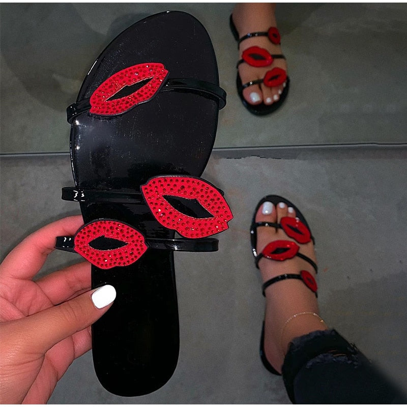 Sandalias planas con apliques en forma de labios con material de PU y goma