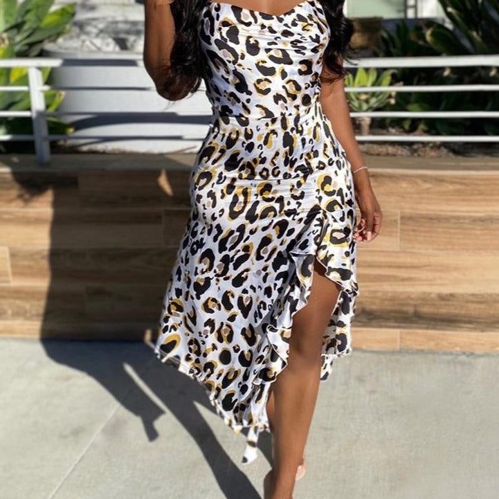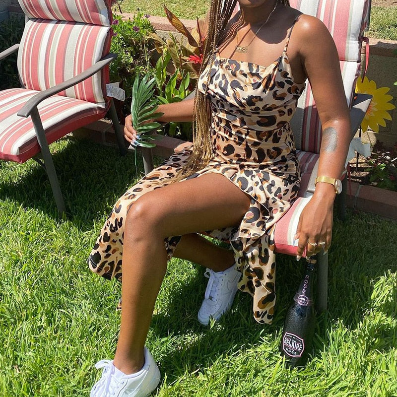 Vestido midi con estampado de leopardo, escote cuadrado, abertura alta y tirantes finos