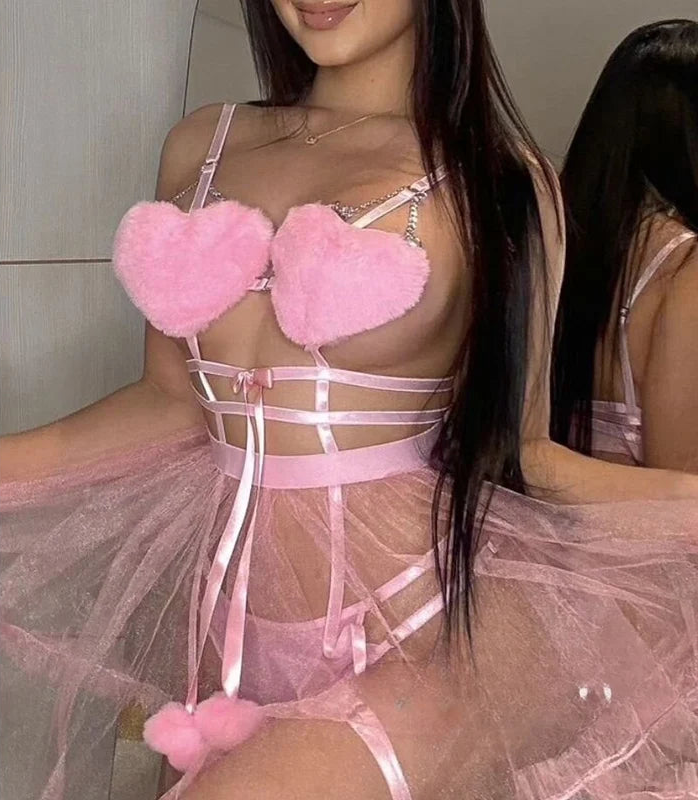 The Burning Blush Lingerie combines sheer polyester and rayon fabric with playful pom pom accents for a daring, see-through look that captivates. Designed to reveal just enough, it boldly celebrates your confidence and sensuality with every wear.
