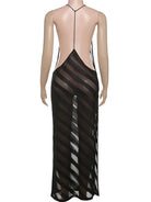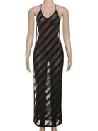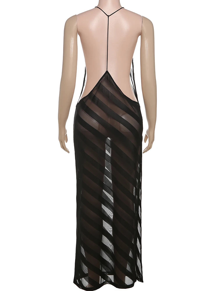 Make a statement in this daring maxi dress that commands attention. Featuring a striking striped pattern and a bold backless design, it's crafted for those who embrace confidence without compromise. The sheer fabric adds an alluring touch of mystery while maintaining an elegant silhouette. Perfect for evening events where you're ready to turn heads and own the room with unapologetic style.