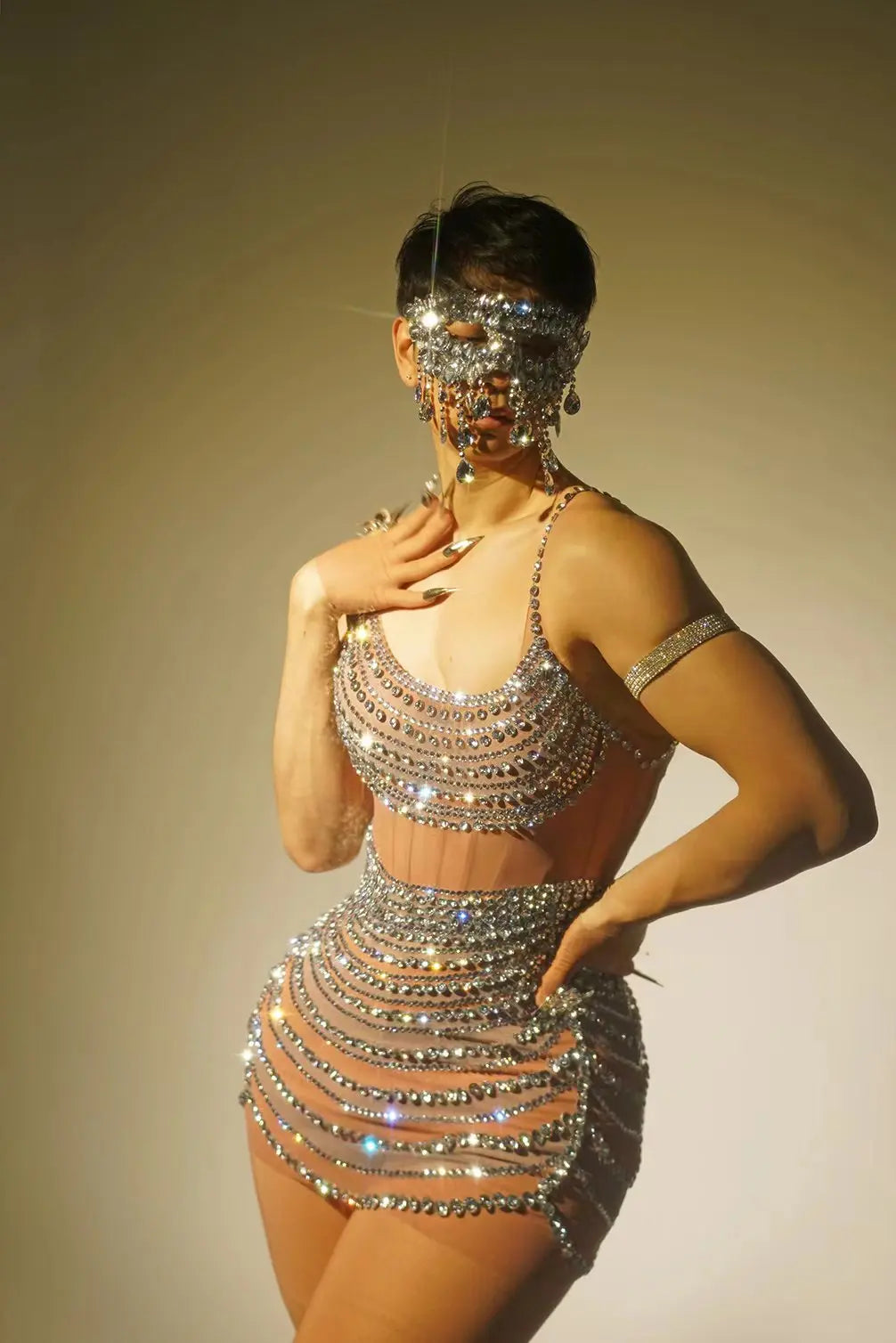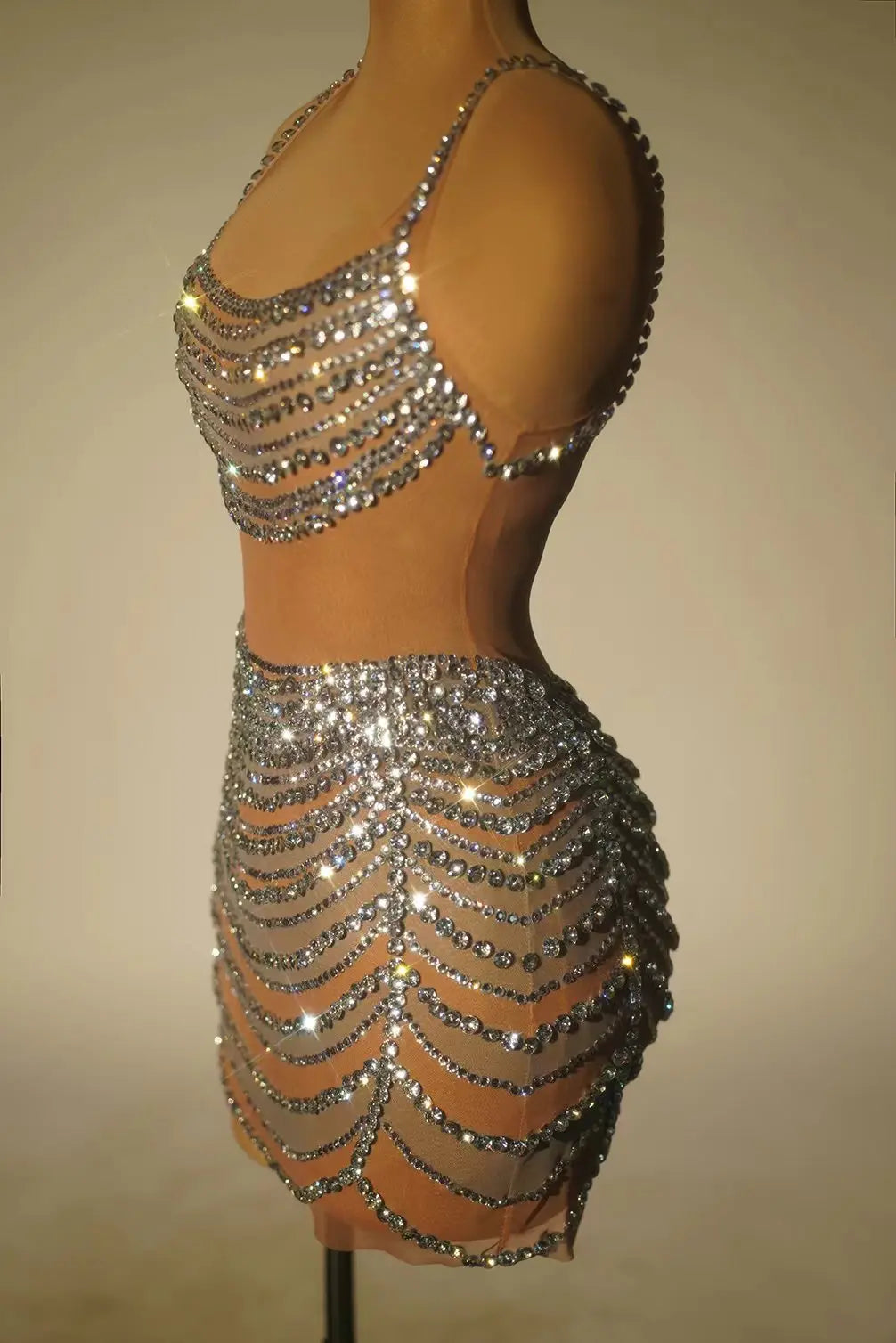 Unleash your inner sparkle with our Staying The Night Mini Dress! Made from luxurious rayon and adorned with dazzling rhinestones, this sleeveless dress boasts spaghetti straps that accentuate your figure. Perfect for a night out, this dress will make you shine with confidence and style!