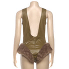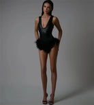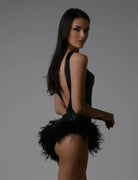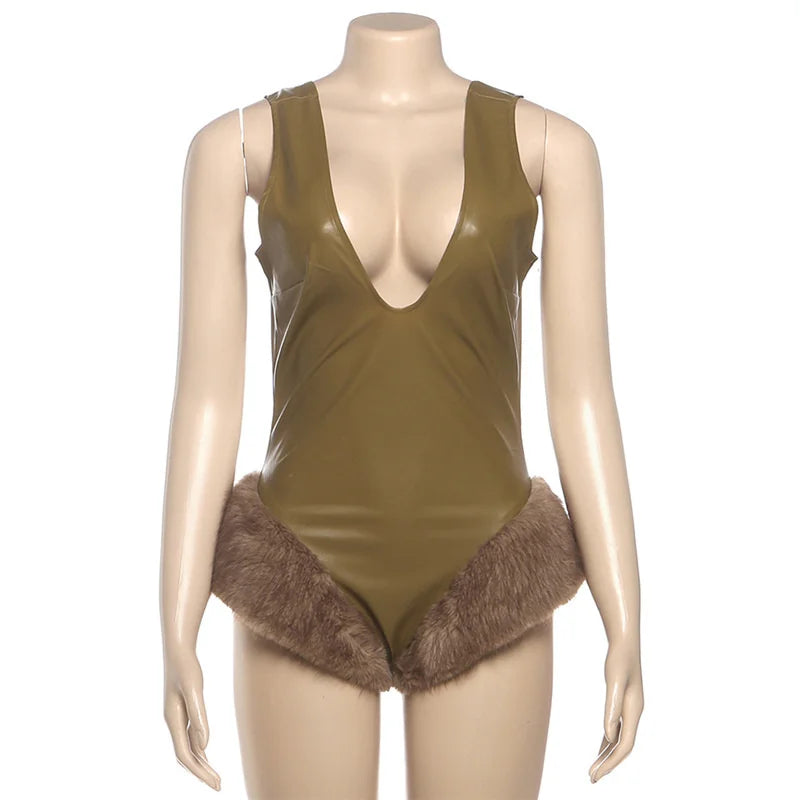 Own the room in this audacious bodysuit that fuses edge with elegance. Built from a responsive polyester and spandex blend, it hugs your curves while the luxurious fur detailing adds an unexpected touch of glamour and rebellion. The clean solid base lets the statement-making fur take the spotlight, creating a look that's equal parts fierce and refined. Perfect for those ready to challenge conventions and make an unforgettable entrance.