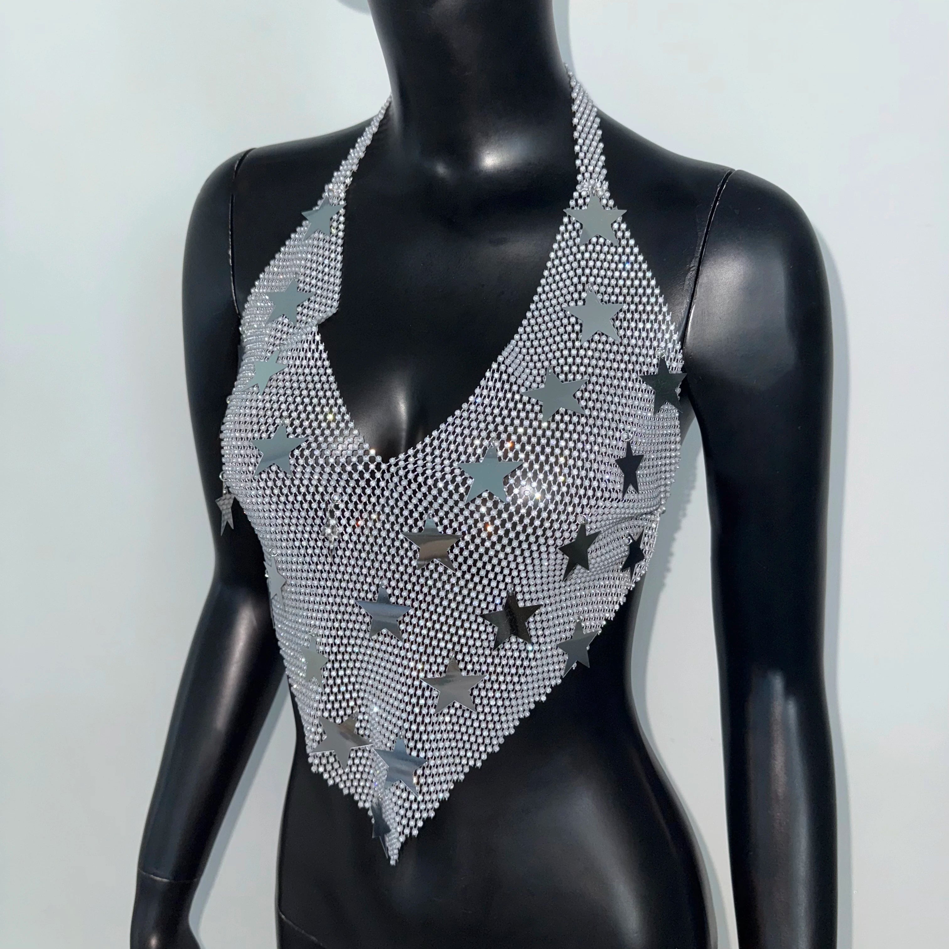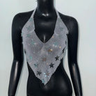 The Wildflower In Ashes Crop Top is a bold statement piece featuring a backless design and star-patterned polyester fabric. This daring top combines edgy allure with celestial charm, perfect for those ready to showcase their fearless style and turn every head in the room. Elevate your wardrobe with this striking standout.