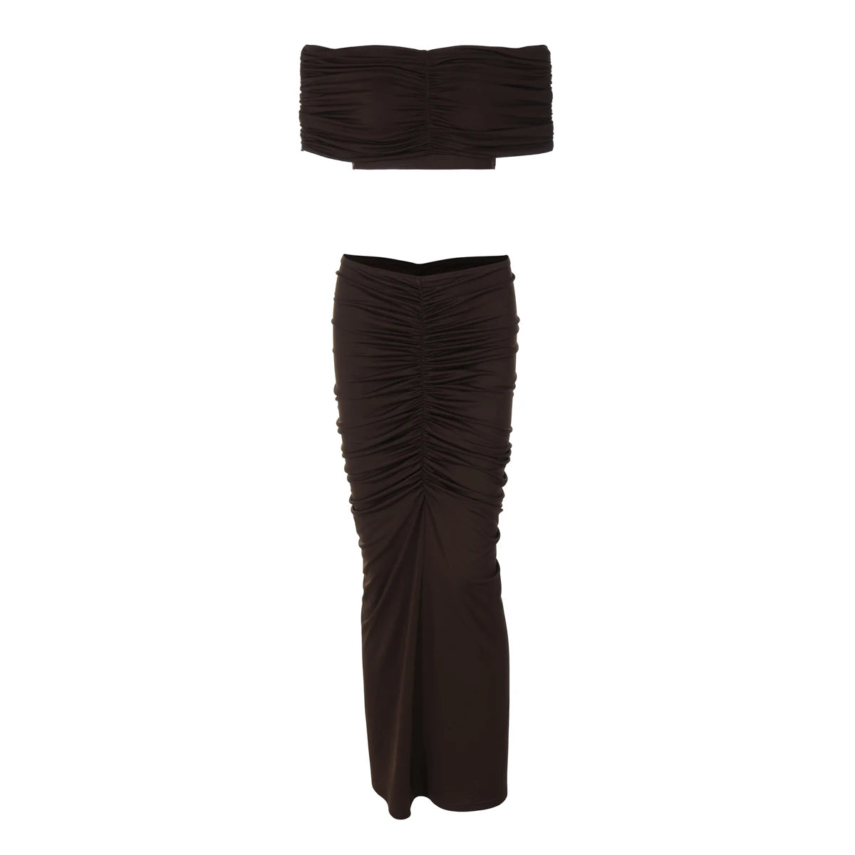 Be the center of attention with our All Of Me Skirt Set! This stunning set features a pleated and ruched design, highlighting your curves while the backless design adds a touch of allure. Made with spandex and polyester, this set is both comfortable and stylish, and the elastic waistband ensures a perfect fit.
