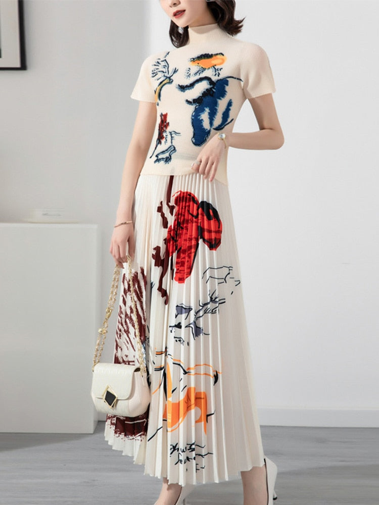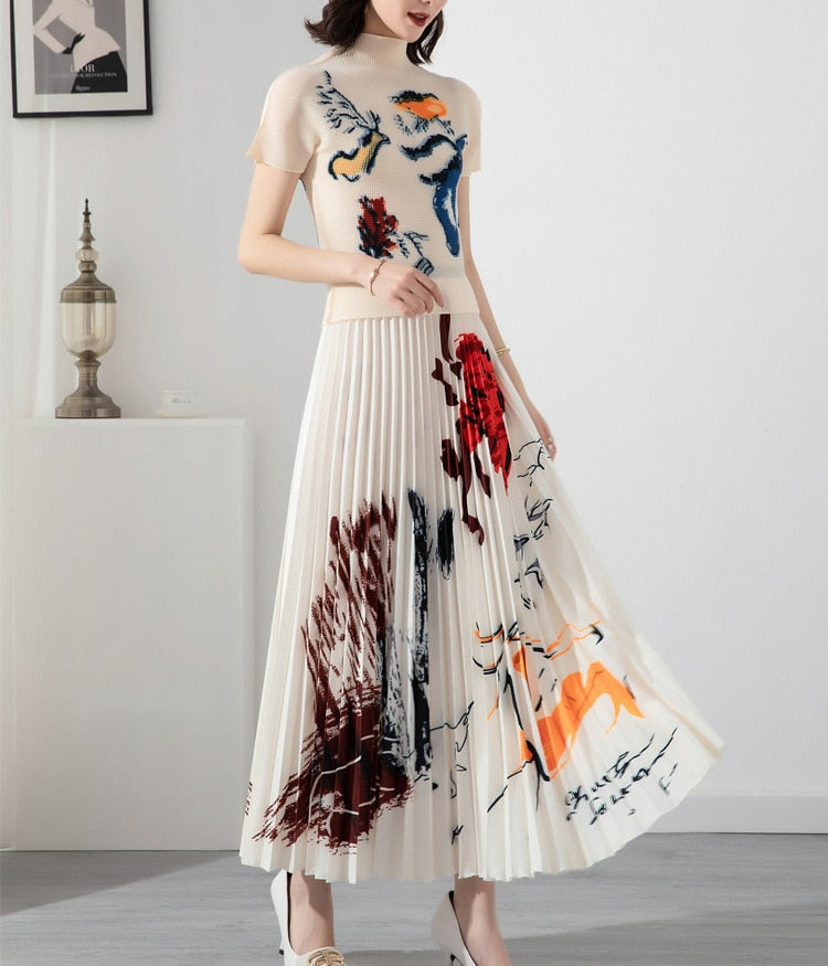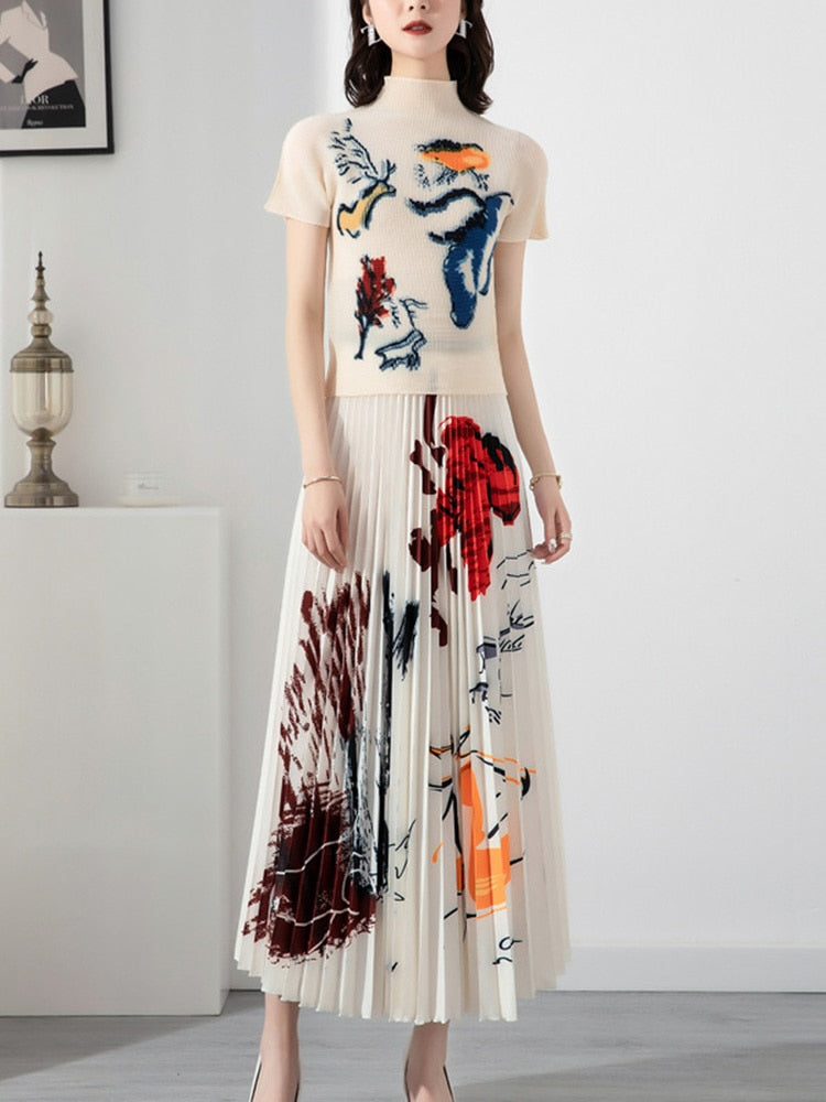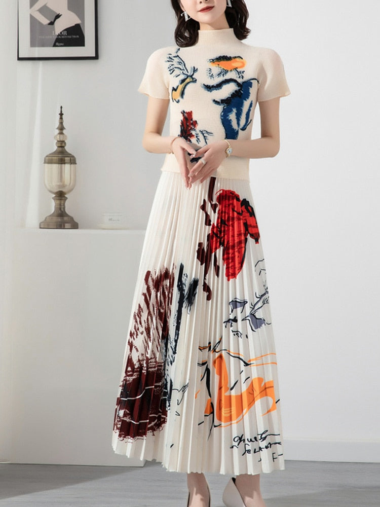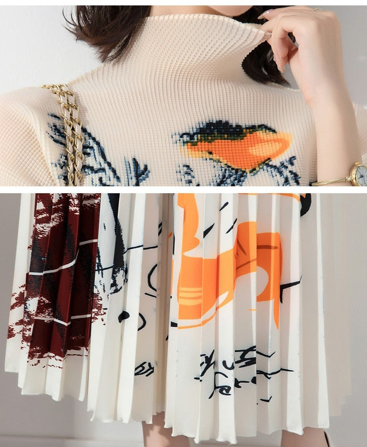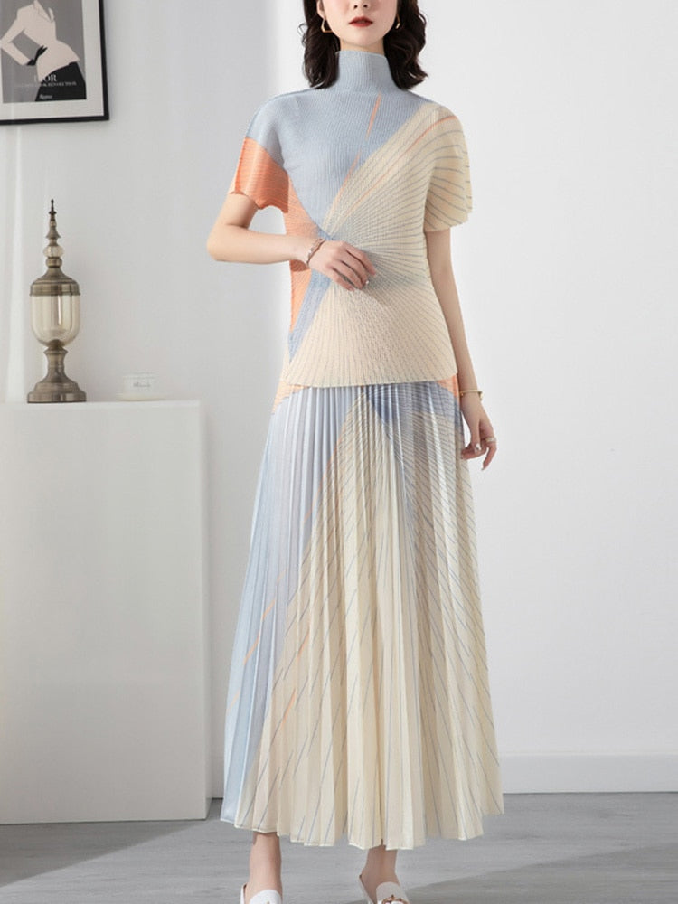 This skirt set offers the perfect mix of fashion and function. The matching tops give off a sophisticated look that is perfect for any occasion. Delicate design details like a turtleneck and pleated skirt add a feminine touch to this simple but striking ensemble. This polyester skirt set is durable and has been designed to last.