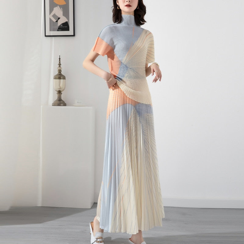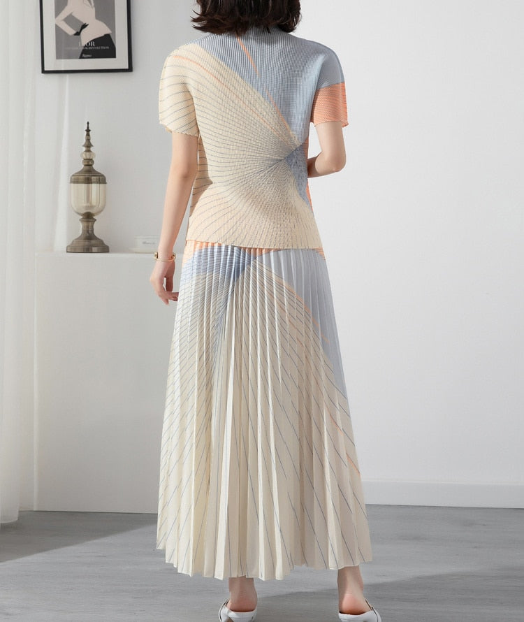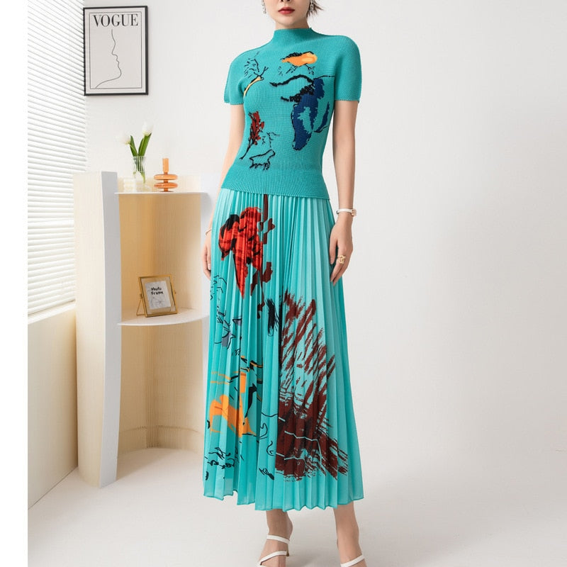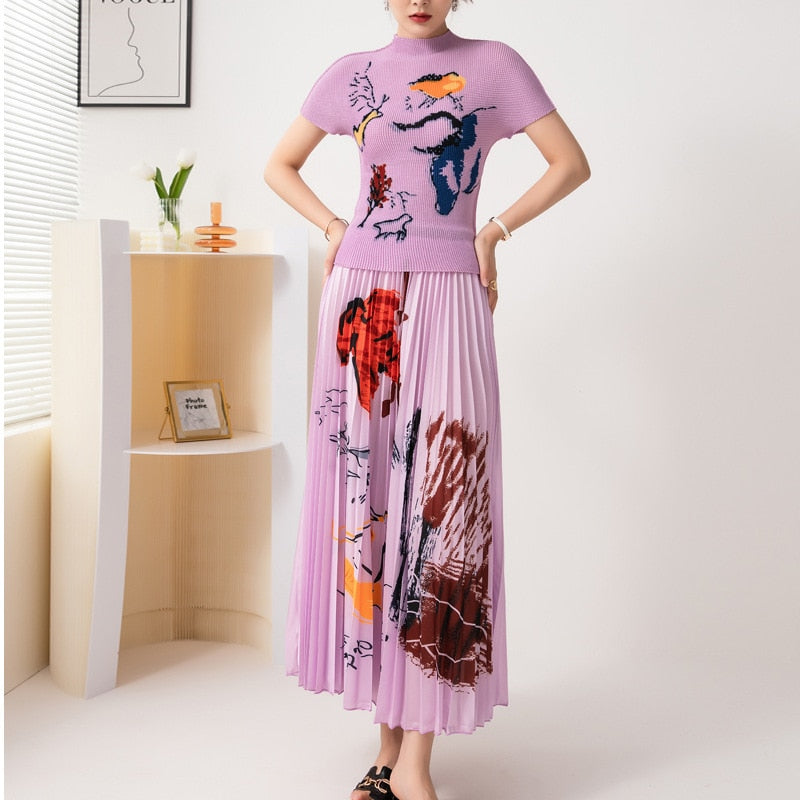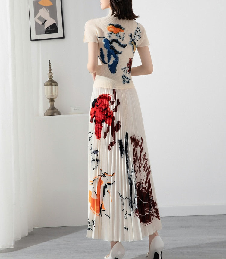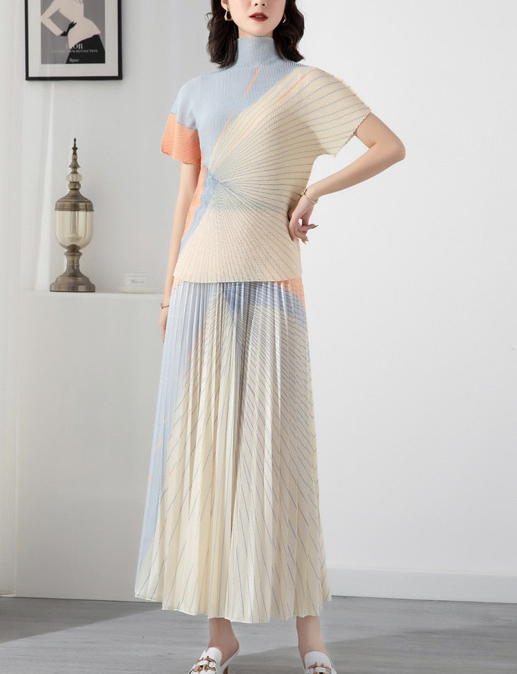 This skirt set offers the perfect mix of fashion and function. The matching tops give off a sophisticated look that is perfect for any occasion. Delicate design details like a turtleneck and pleated skirt add a feminine touch to this simple but striking ensemble. This polyester skirt set is durable and has been designed to last.