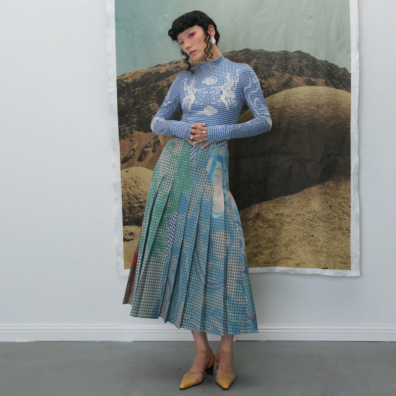 Jersey de algodón en camisa con estampado de cuadros de cuello alto y manga completa