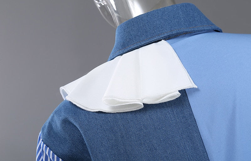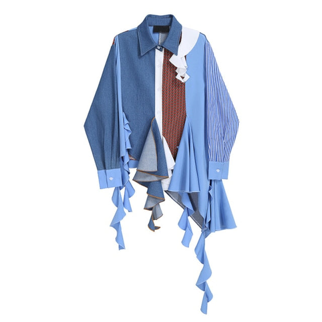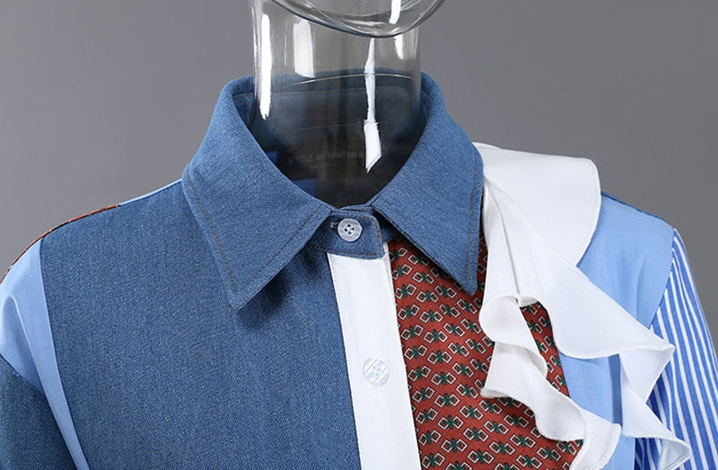 Camisa asimétrica estilo patchwork con cuello vuelto y cierre de botonadura sencilla