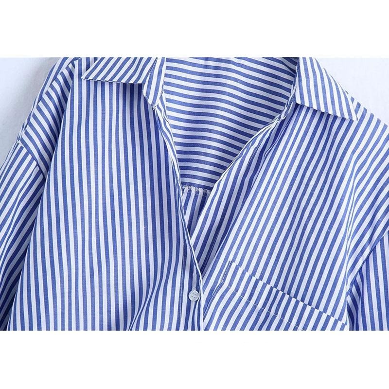 Camisa corta de manga completa con estampado de rayas, cuello vuelto y cierre de un solo pecho