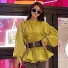 Blusa de algodón liso de manga completa con cuello alto y cierre de un solo pecho