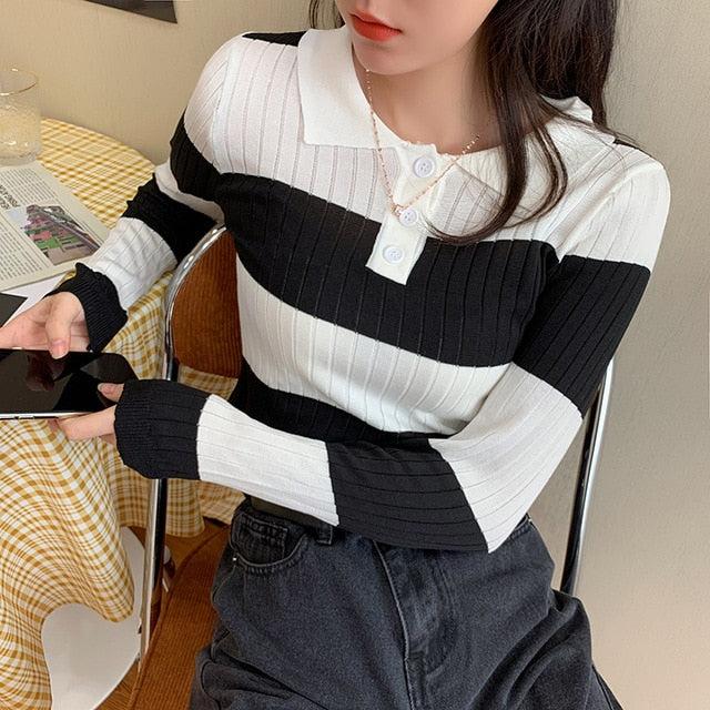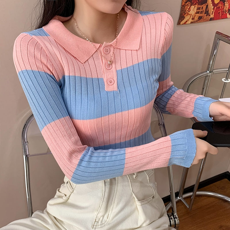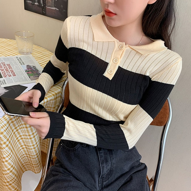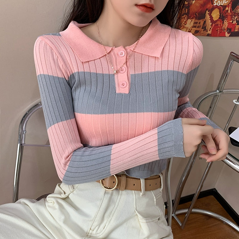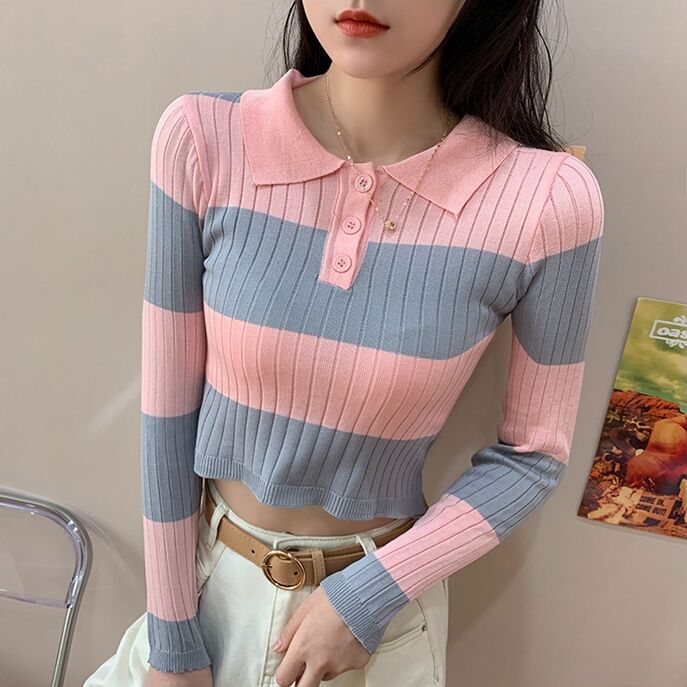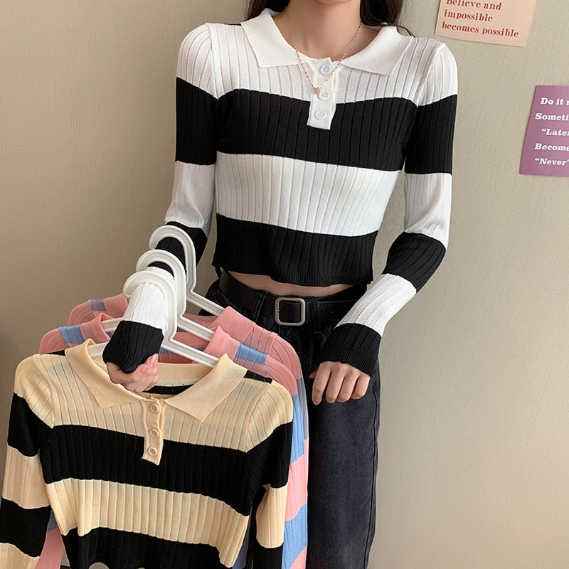 Camisa a rayas de manga larga con cuello vuelto, tipo de longitud corta y material de viscosa de poliéster