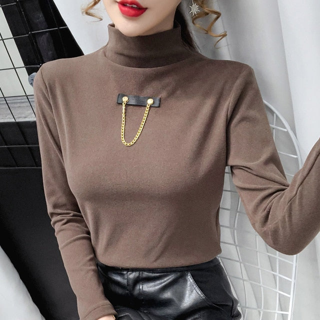 Camiseta de cuello alto de manga larga con decoración de cadena y material de poliéster spandex