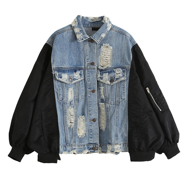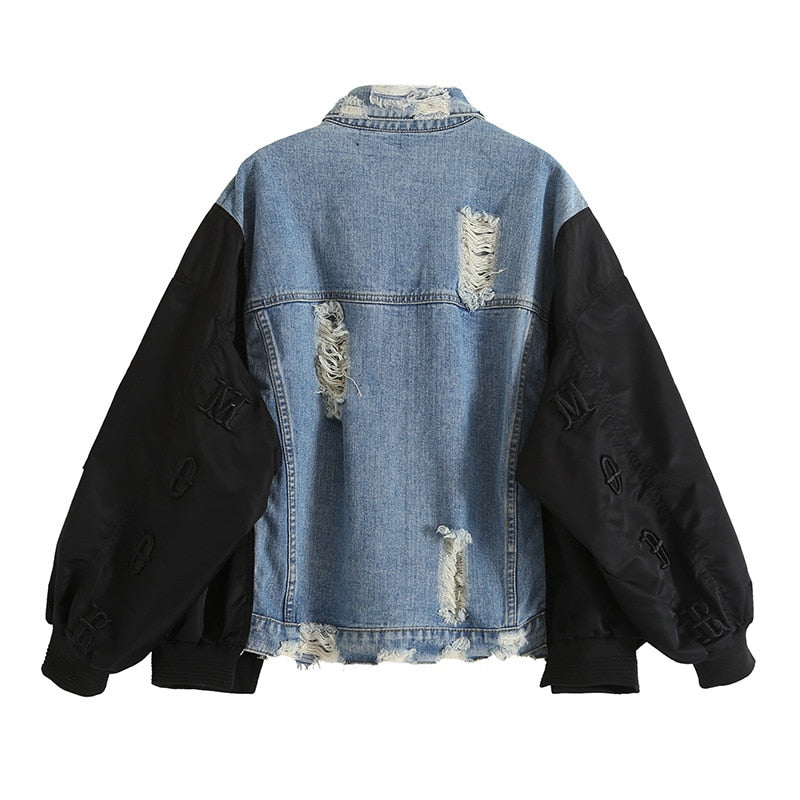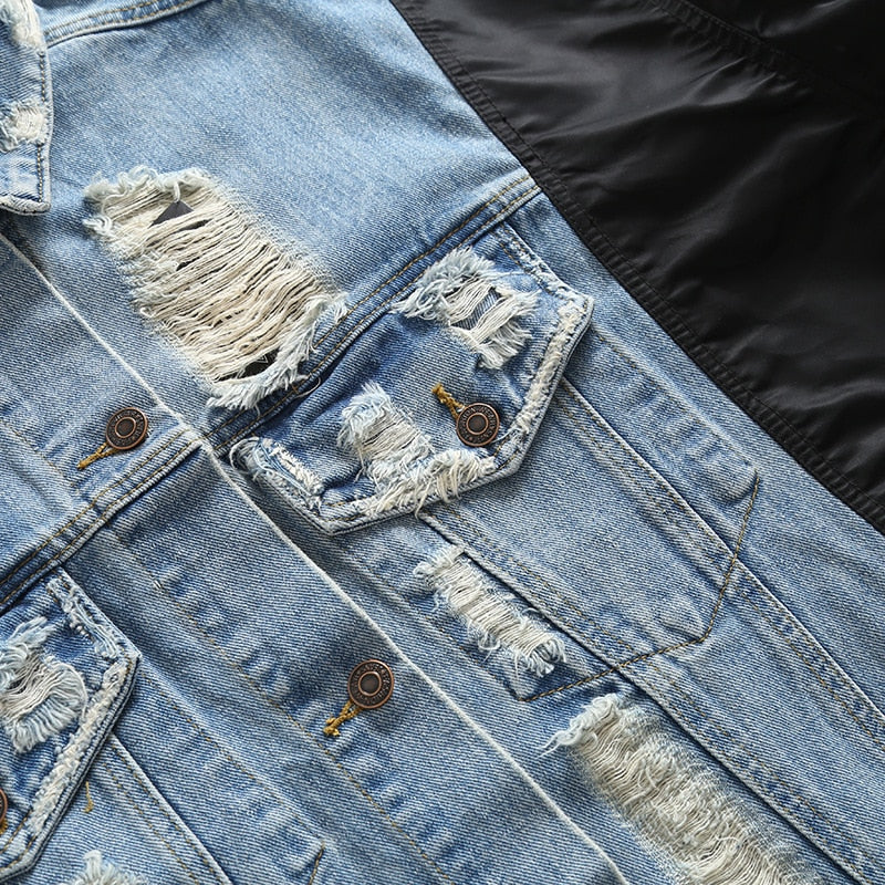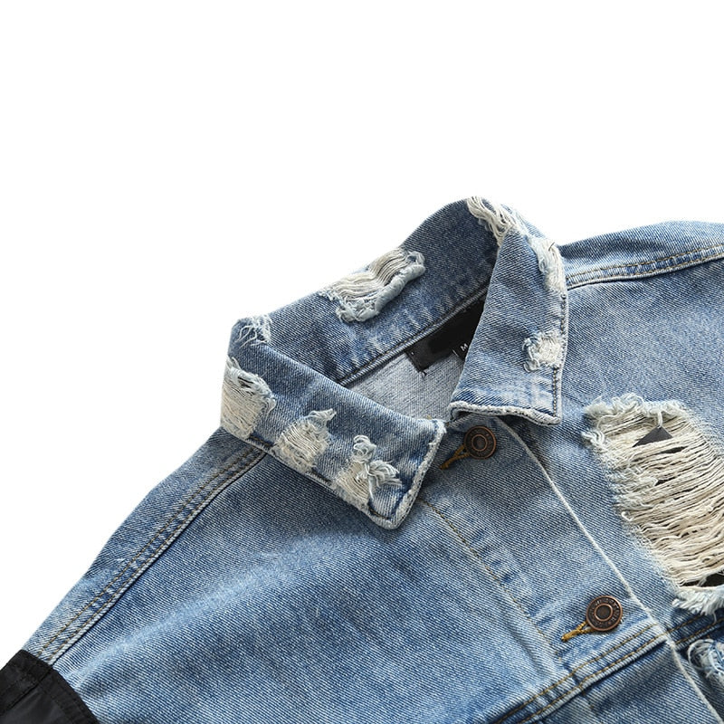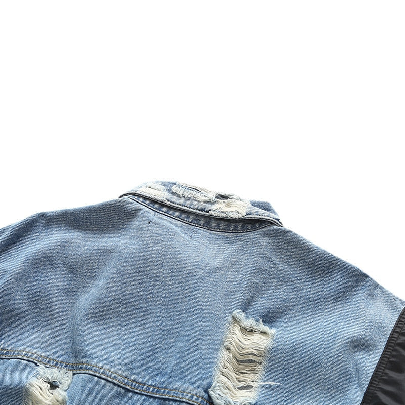 Chaqueta azul vintage rasgada con bolsillo, decoración de cremallera, cierre de botonadura sencilla y material de algodón