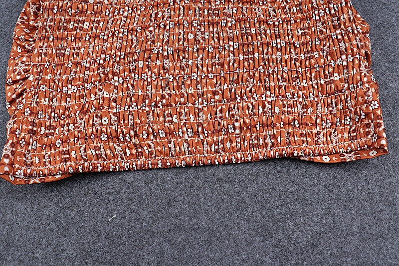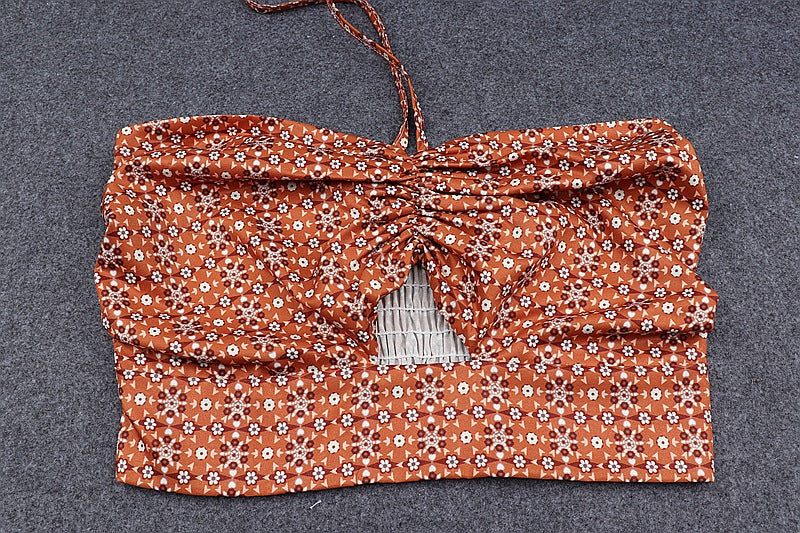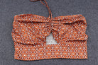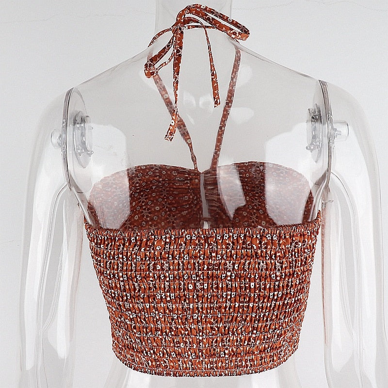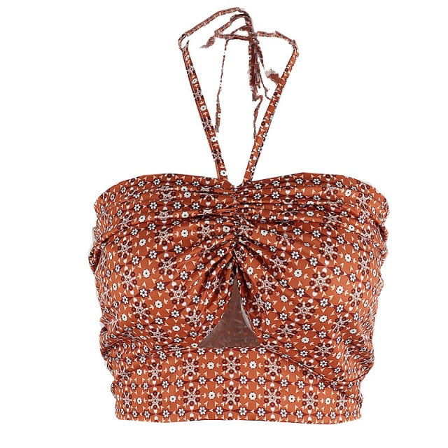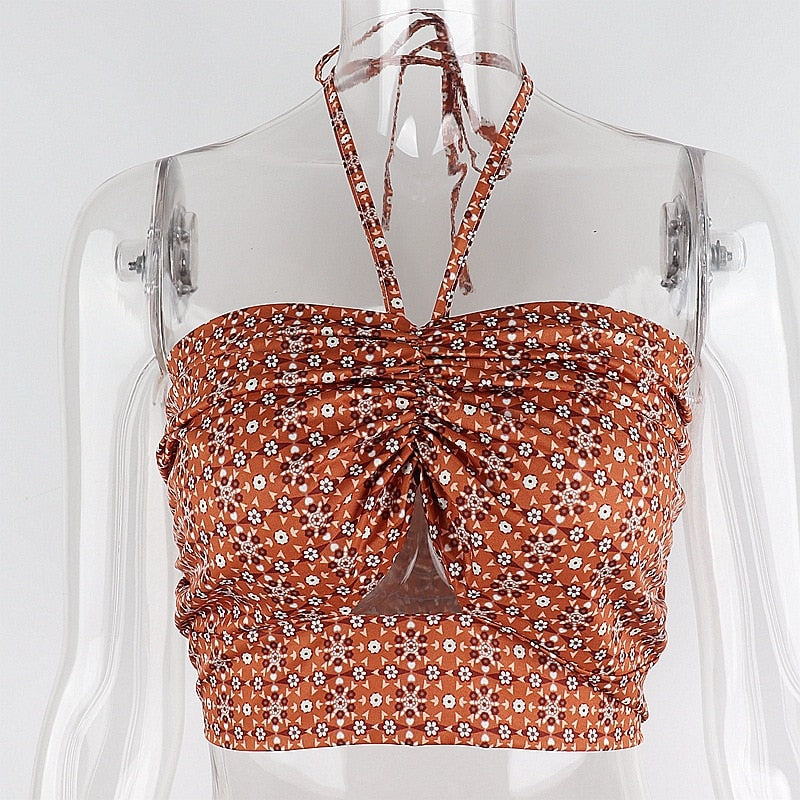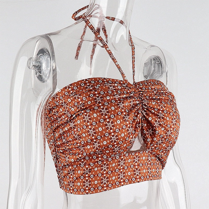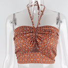 Top corto estilo fruncido con tirantes halter y estampado de flores geométricas