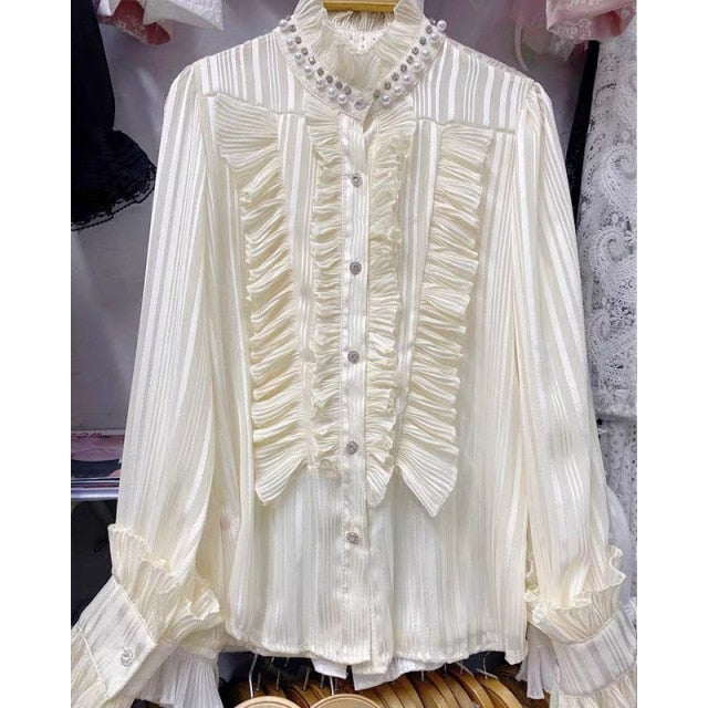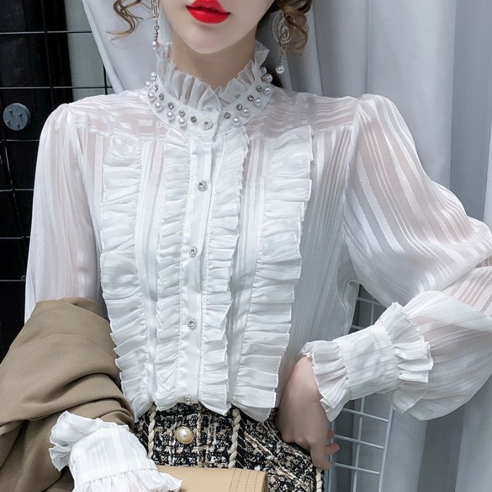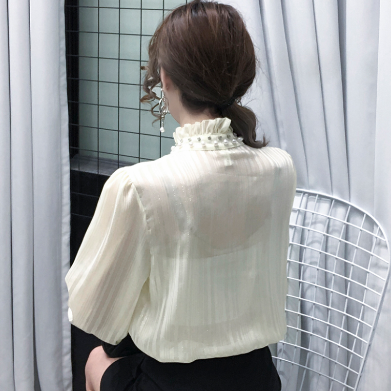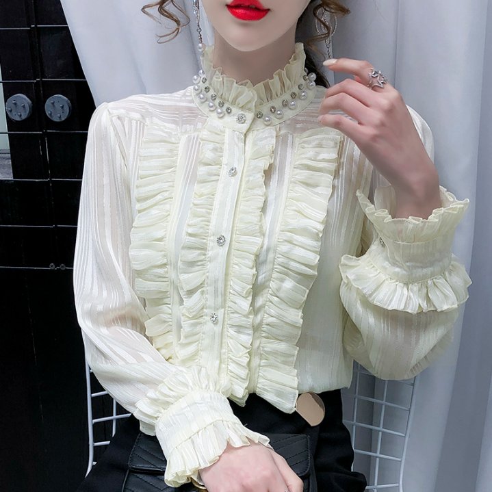Dress up without many layers with this blouse. The ruffles are a long-lasting style. The pearly turtleneck design adds a touch of glamour to your look. The soft pastel colors also bring the spring season early. A perfect top to welcome the new season.