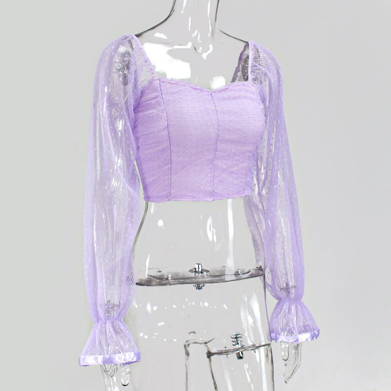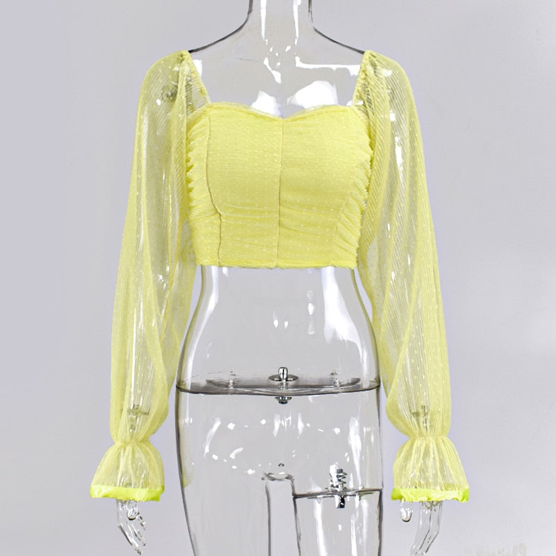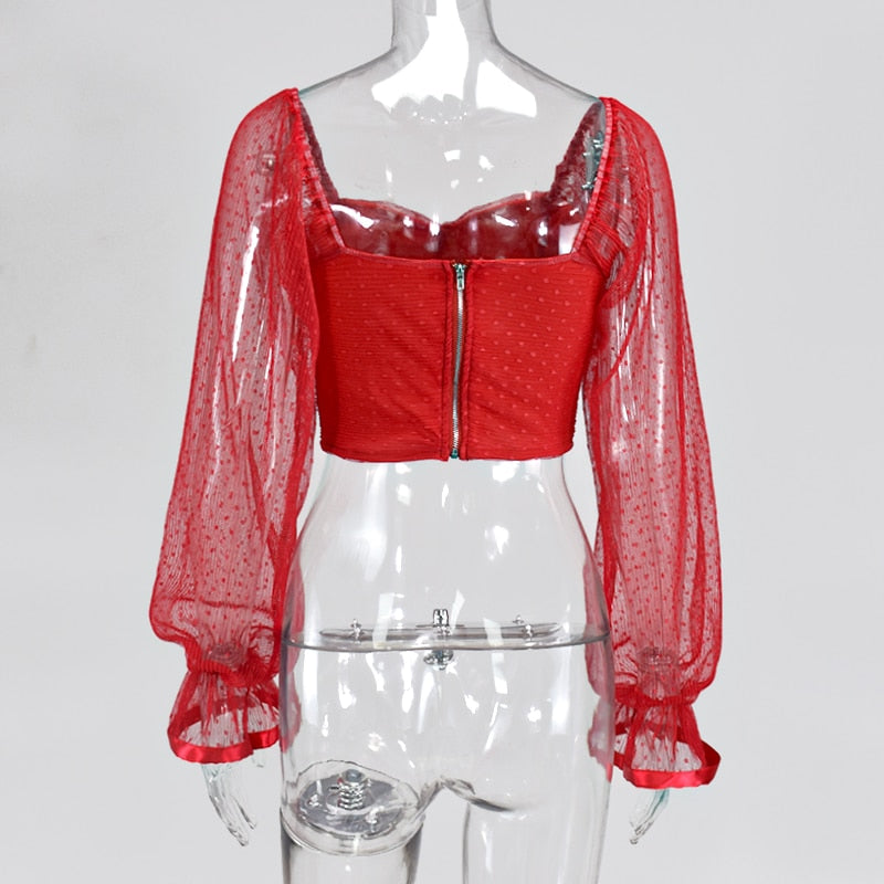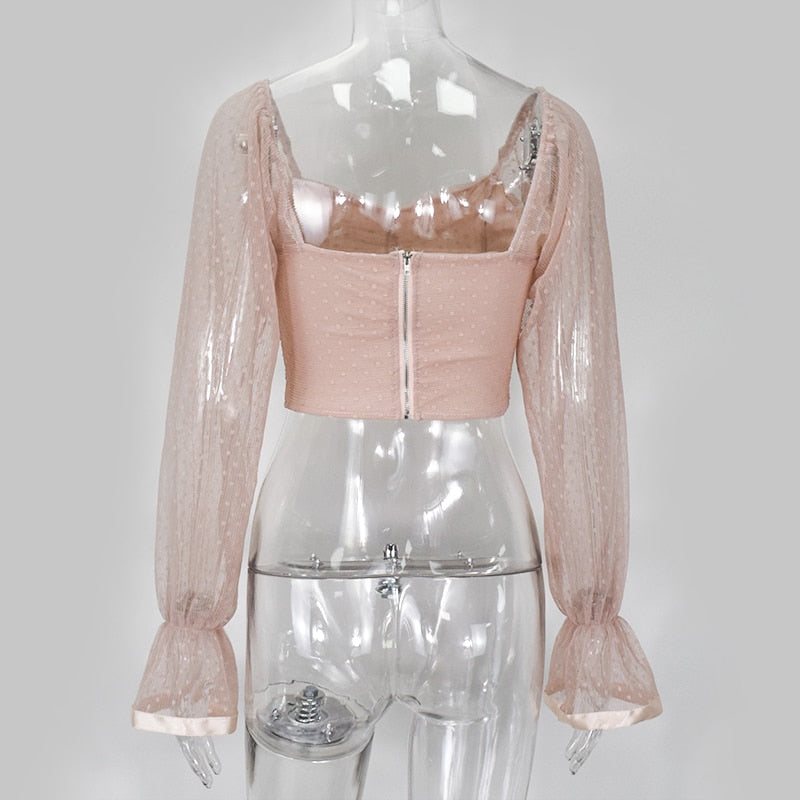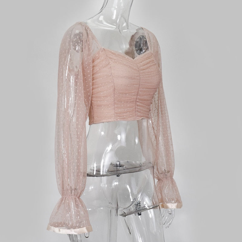 <transcy>Blusa con pliegues de mujer de manga de linterna de lunares con escote corazón rosa vintage</transcy>