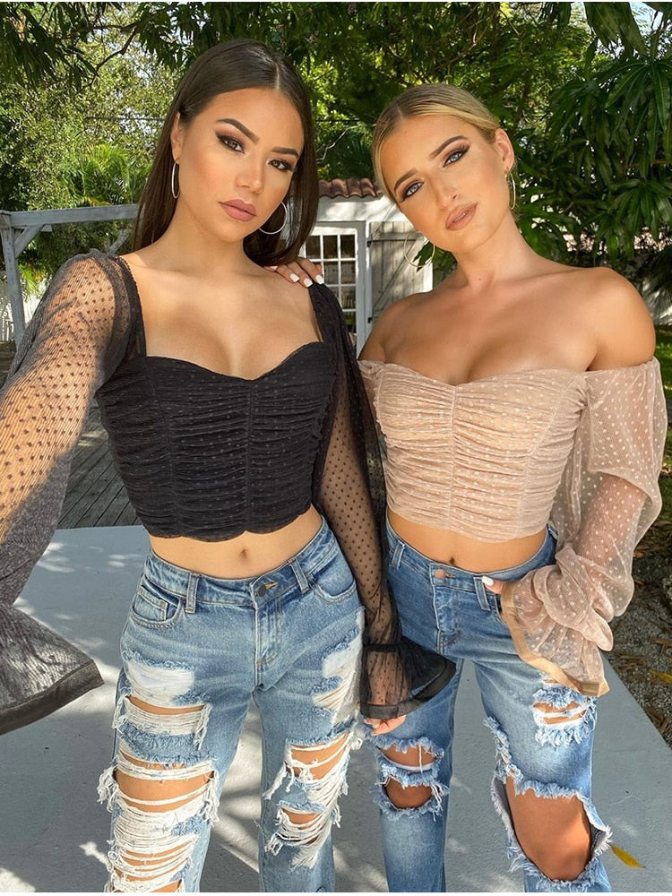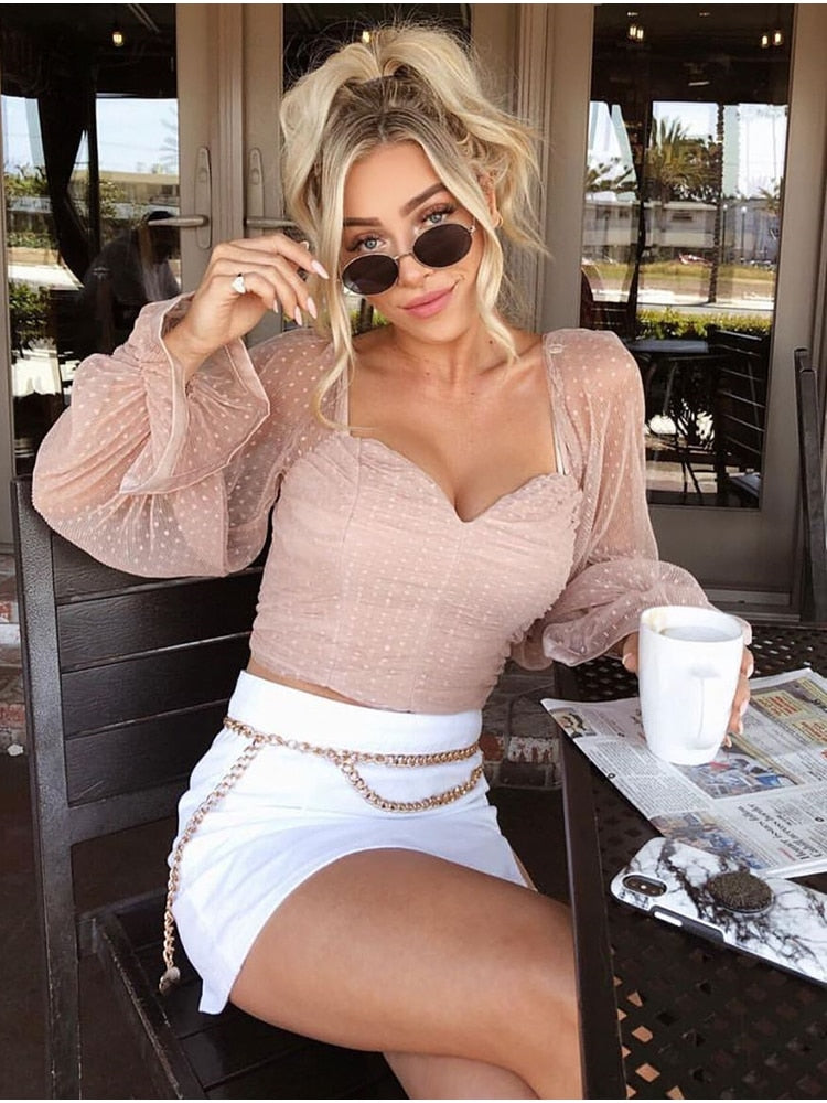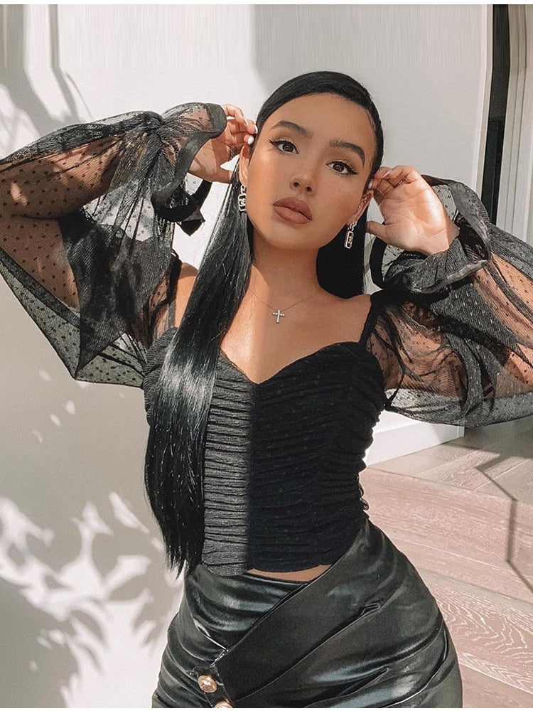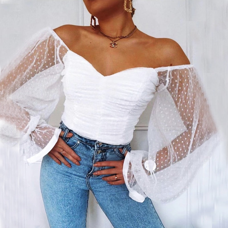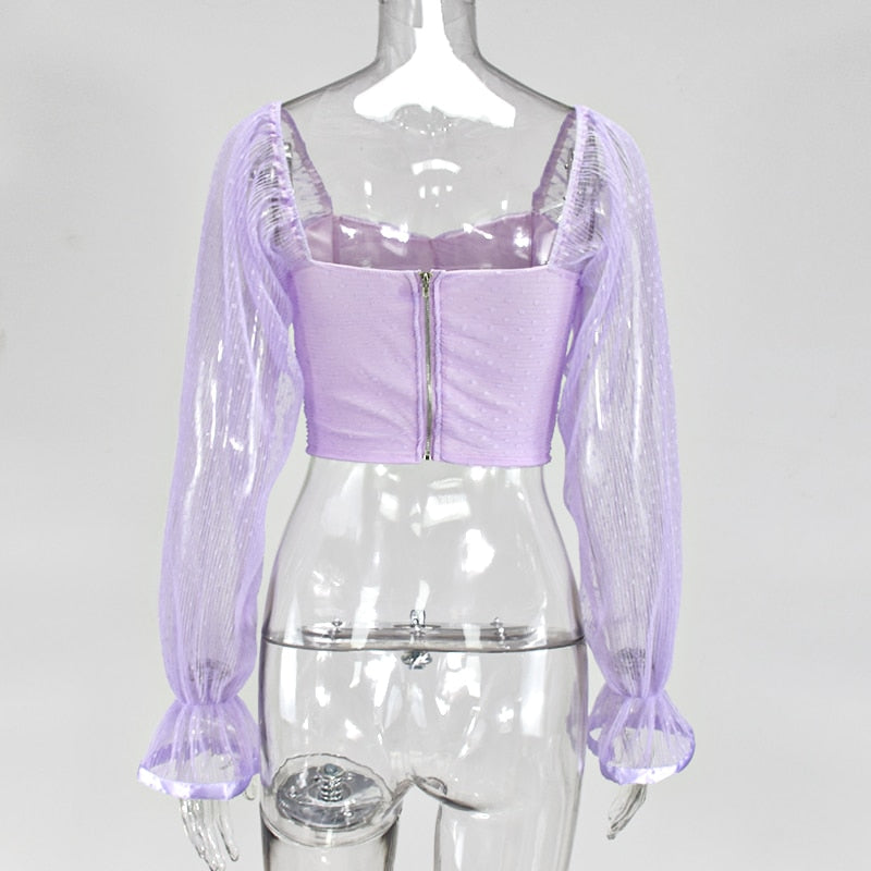 <transcy>Blusa con pliegues de mujer de manga de linterna de lunares con escote corazón rosa vintage</transcy>