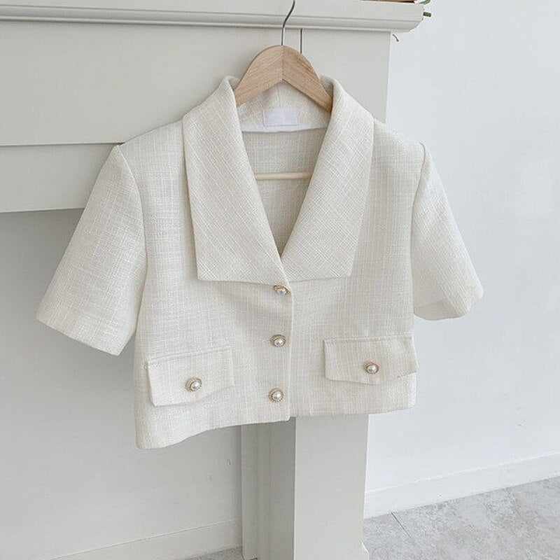 This solid, cotton blazer is a wardrobe staple. It features a notched collar, single-breasted closure, and short sleeves. The blazer is perfect for those who want to feel professional, yet stylish.