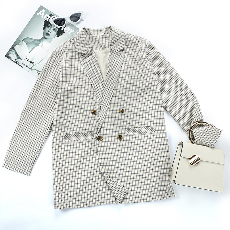 Plaid Pattern Double Breasted Blazer with Notch Lapel Collar and Front Pocket