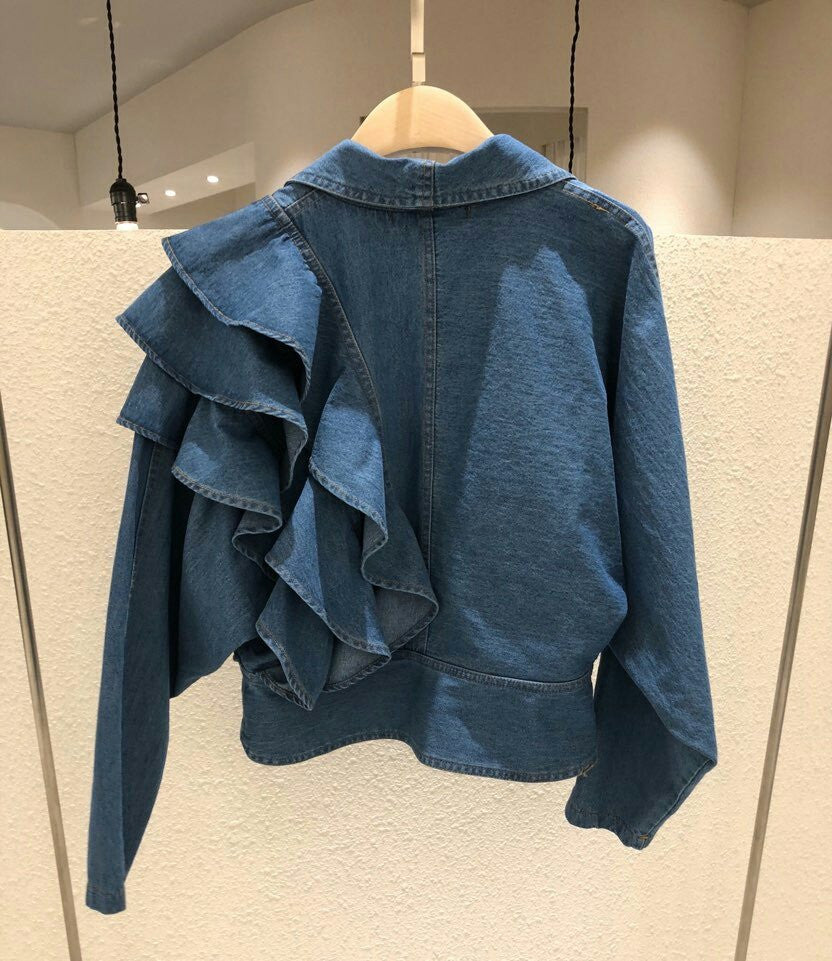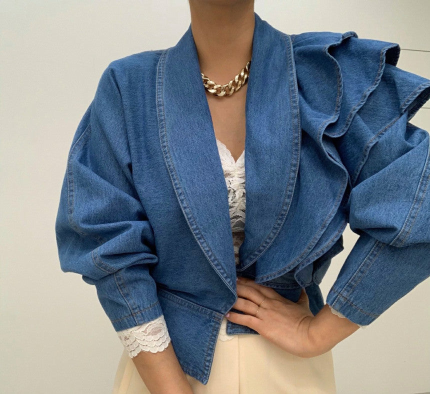 This beautiful blazer is perfect for a professional woman. It is made of cotton and has a blue color. The blazer has a puff sleeve and ruffles. It is available in sizes small and medium.